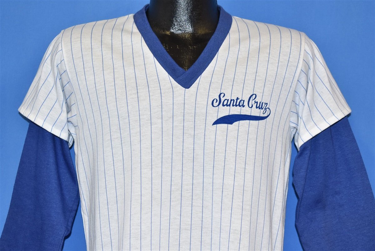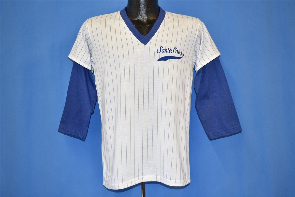 This vintage jersey tee was probably made for a local softball team or baseball league out of Santa Cruz, California. It's a 1970s original with a ton of life left. Features classic pinstripes, roomy v-neck collar, and layered quarter sleeves.