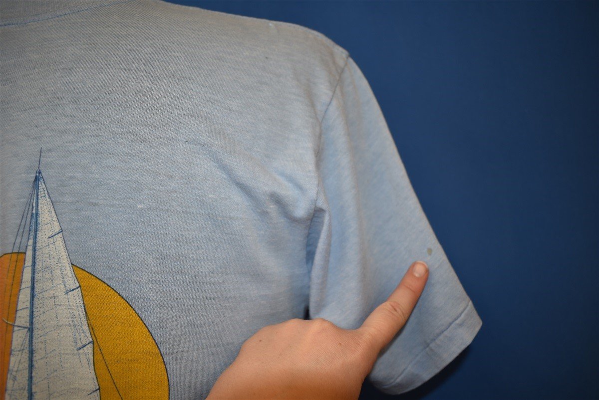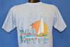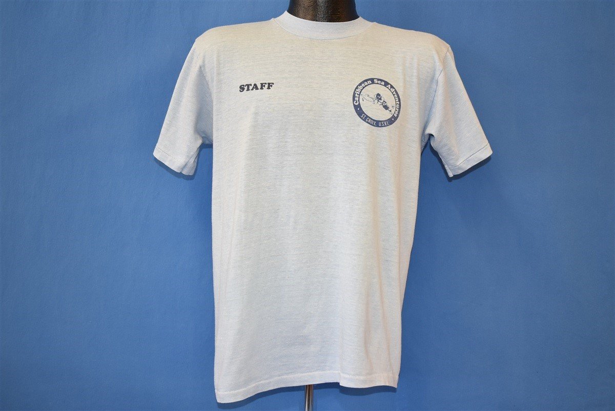 This shirt has a large graphic on the back of a sailboat in the ocean at sunset. It says "Sea Rover". On the front, it says "Caribbean Sea Adventures" and "St. Croix, USVI.". St. Croix is part of the US Virgin Islands in the Caribbean. The islands are a popular vacation destination for snorkeling, sailing, and swimming.