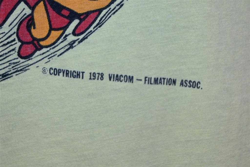 This awesome 70s tee features the cartoon superhero Mighty Mouse, who was created by Terrytoons, the same animation studio that gave birth to Deputy Dawg, Heckle and Jeckle, and Tom Terrific. Mighty Mouse starred in 80 theatrical shorts, but it wasn't until he was granted his own television series in 1955, that he became one of Terrytoons' most popular creations. The character then reappeared in the late 70s, in a series called The New Adventures of Mighty Mouse and Heckle & Jeckle, then once more in the 80s in Mighty Mouse: The New Adventures.