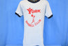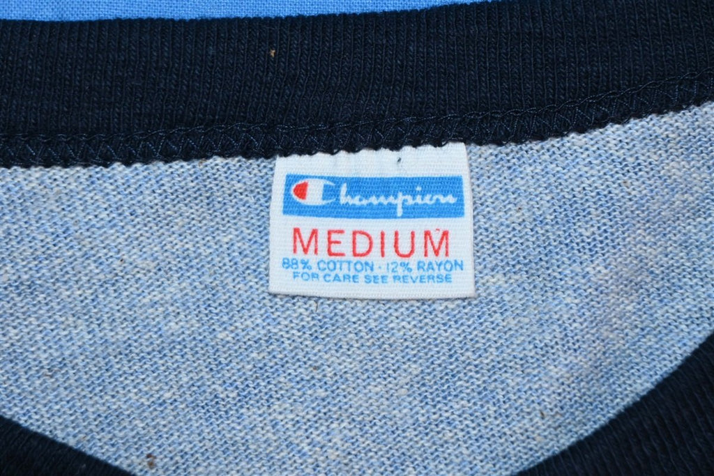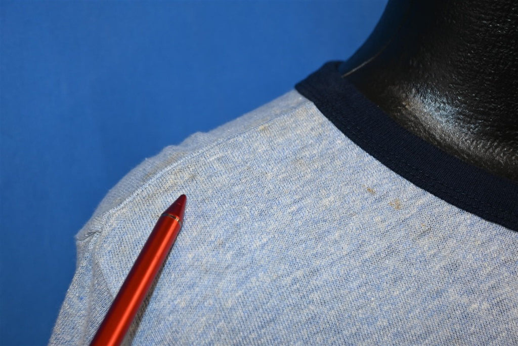 This awesome rayon blended ringer was made for the legendary York Barbell Club, a fitness equipment manufacturer that has a celebrated history in the weightlifting community. The company was started by Bob Hoffman in the 30s. Nicknamed the "Father of World Weightlifting", Hoffman was integral to the development of the sport and an avid proponent for the benefits of exercise and nutrition.
