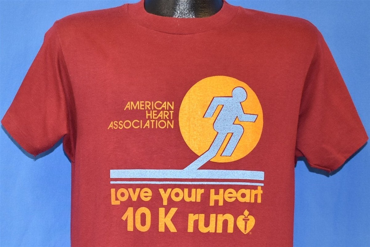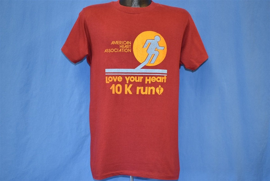 This vintage tee was specially made for the American Heart Association 10K sometime during the eighties. It's aged great over the years and ready for many more. Features soft poly cotton, double sided print, and super old school graphics.