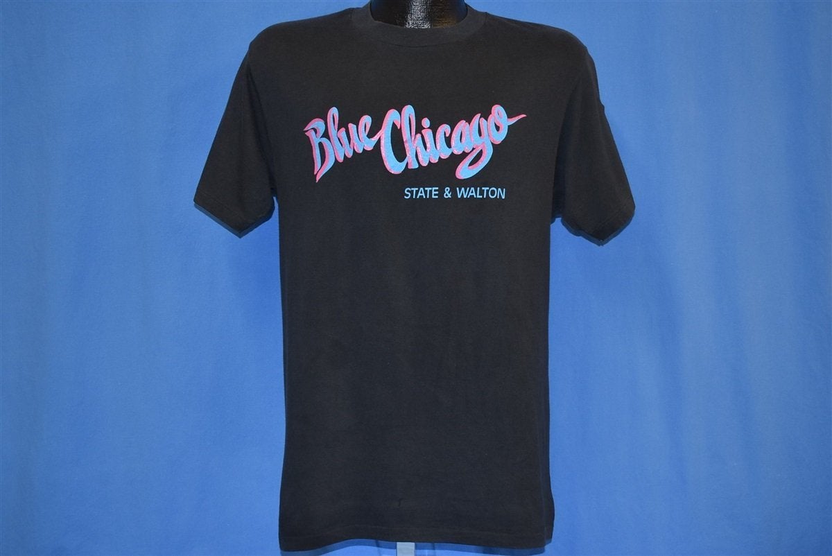 This cool black vintage shirt is for the Blue Chicago, a blues club which has been sharing the best of Chicago blues since 1985. The club is located at the center of the River North entertainment district. Over the years they have hosted a number of acts and blues legends including Koko Taylor, Karen Carroll, Bonnie Lee, Johnny B Moore, Willie Kent, Magic Slim, Eddie Clearwater, Eddie Shaw, Eddie Lusk, and Buddy Scott. This shirt is a sweet souvenir from the legendary Chicago blues club.