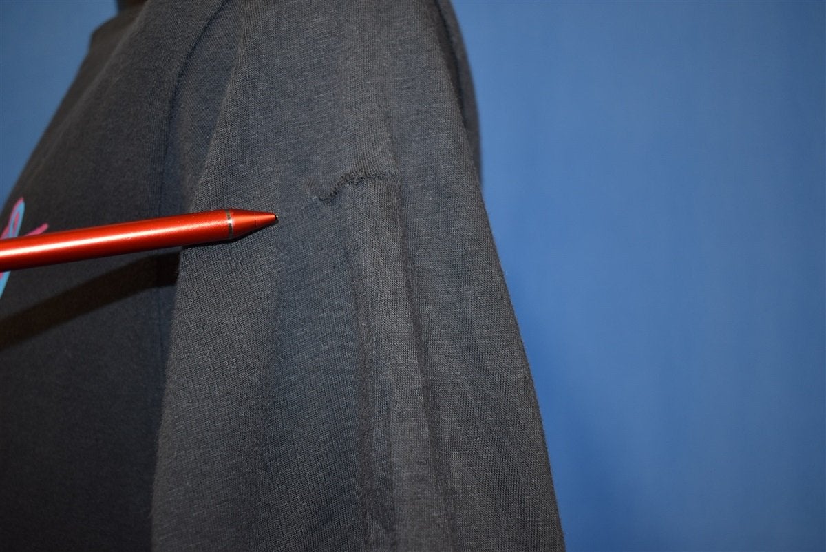 The tag says large but this shirt fits like a modern unisex adult medium. There is a repair on the sleeve, see pics.