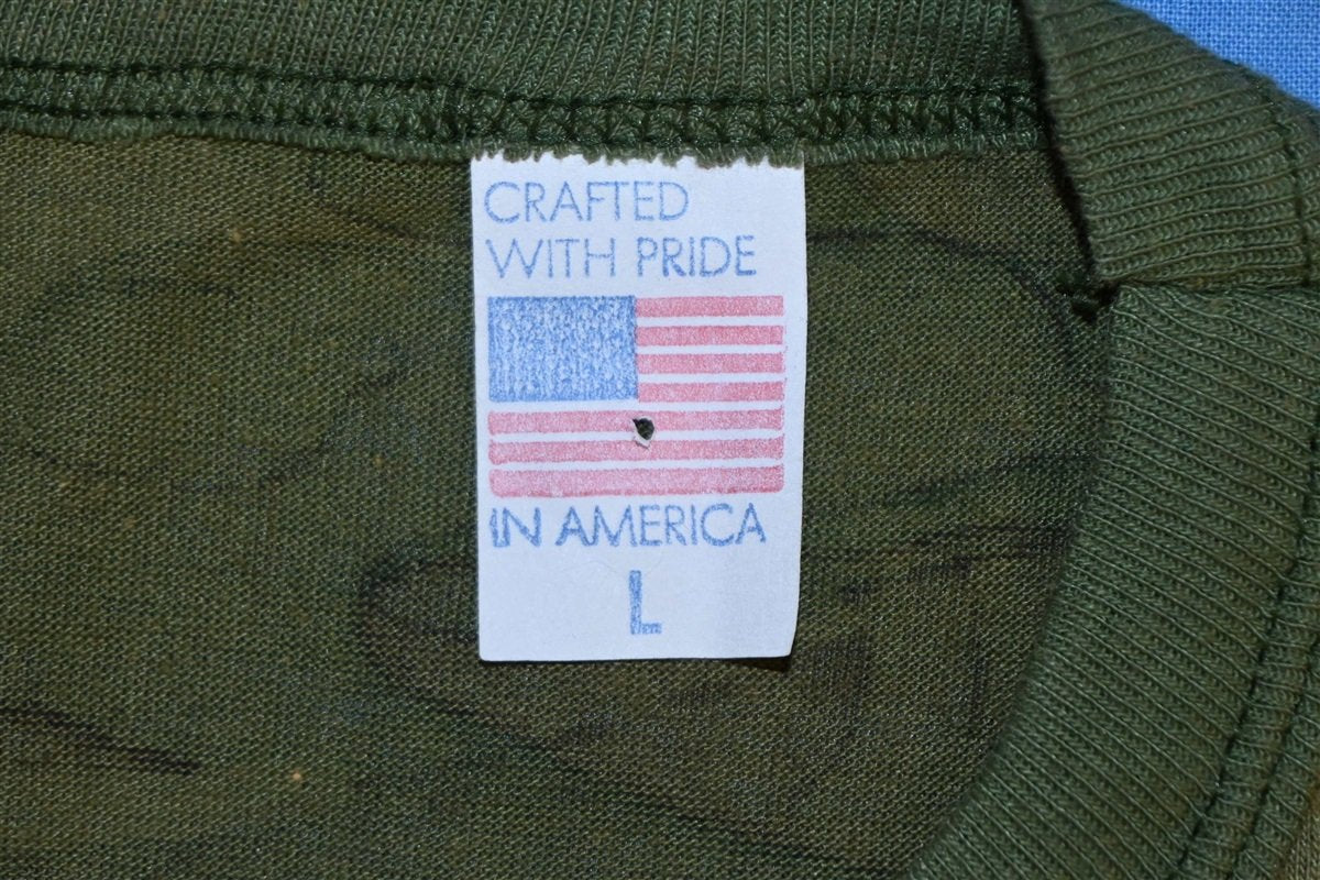 This vintage pocket tee is decked out in a green and brown woodland style camouflage. This camo pattern is the same type that was issued to the United States Armed Forces throughout the 80s and 90s. While camouflage is often associated with the military, the pattern is also seen in streetwear, proving that it can be both practical and stylish.