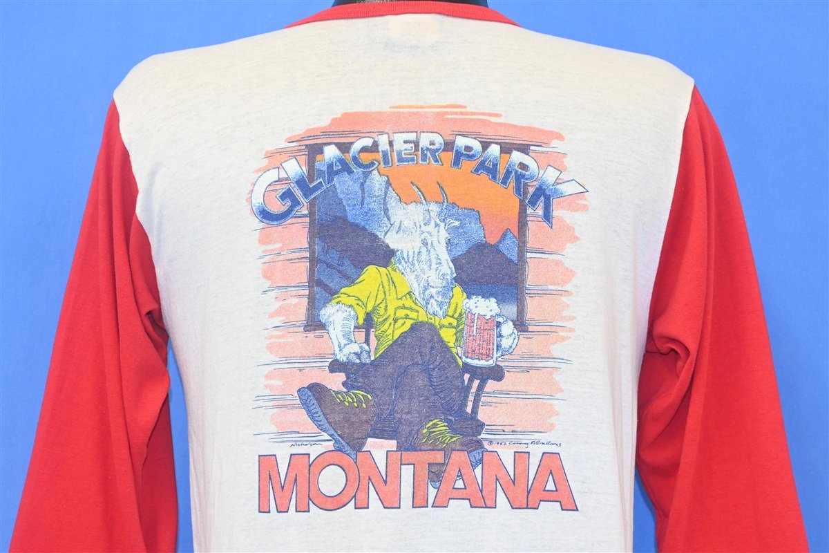 This cool shirt celebrates Glacier National Park in the Rocky Mountains of Montana, and this vintage henley honors the area with a sweet back graphic of a mountain goat enjoying a nice mug of beer. Glacier National Park covers more than 1500 square miles of Montana wilderness, and it gets its named from its numerous glacier-carved peaks and valleys.
