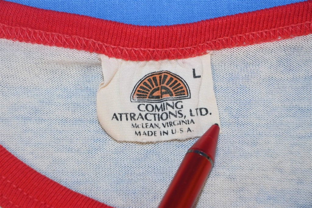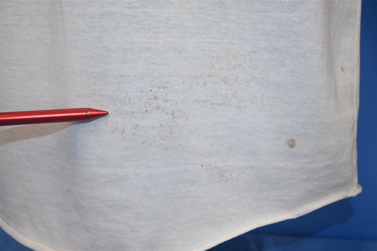 The tag says large but this shirt fits like a modern unisex adult medium. There are several small holes and spots, see pics