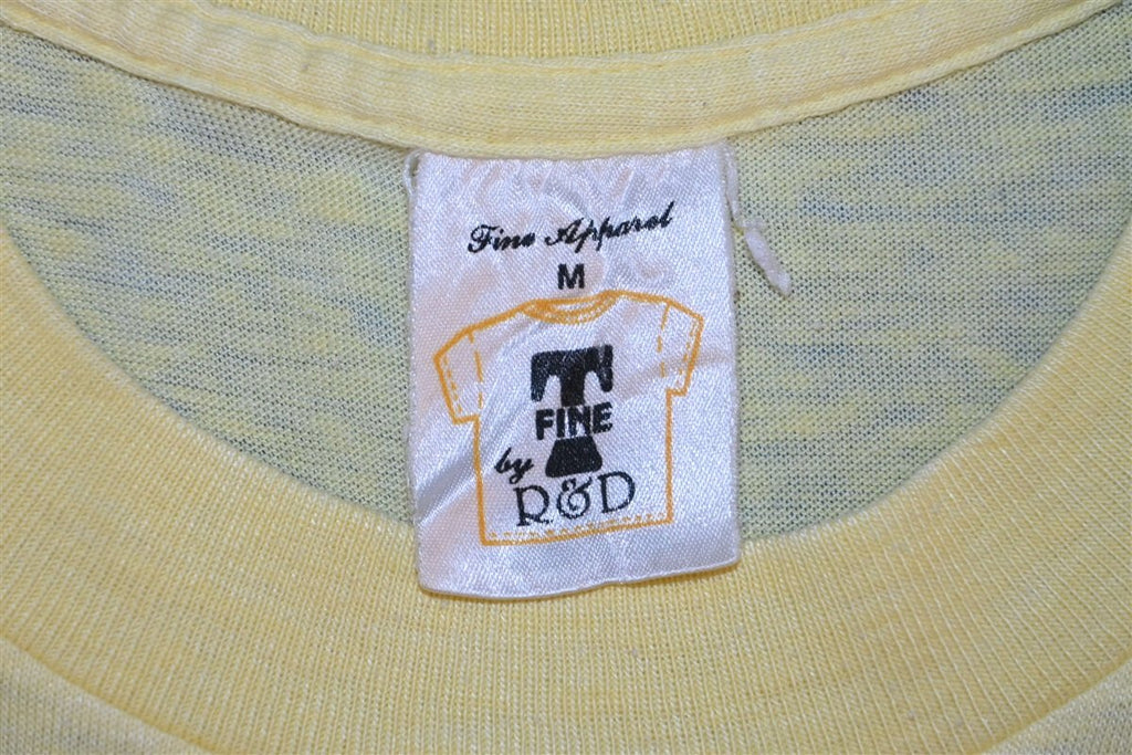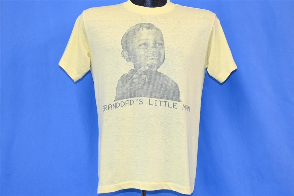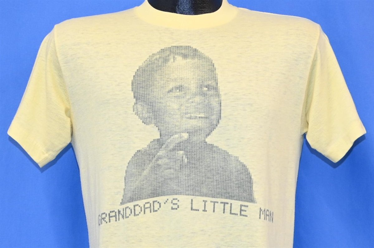 This vintage tee has a portrait of an adorable kid, who according to the caption is "Granddad's Little Man". This shirt was made back in the 80s and personalized using a dot matrix printer. This type of impact printer was once used to recreate low resolution images, using nothing but a series of small symbols, such as dots. Some t-shirt shops used this technology to quickly and easily create custom tees based off a photograph.