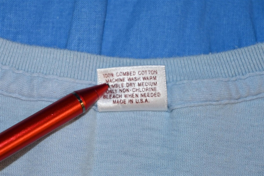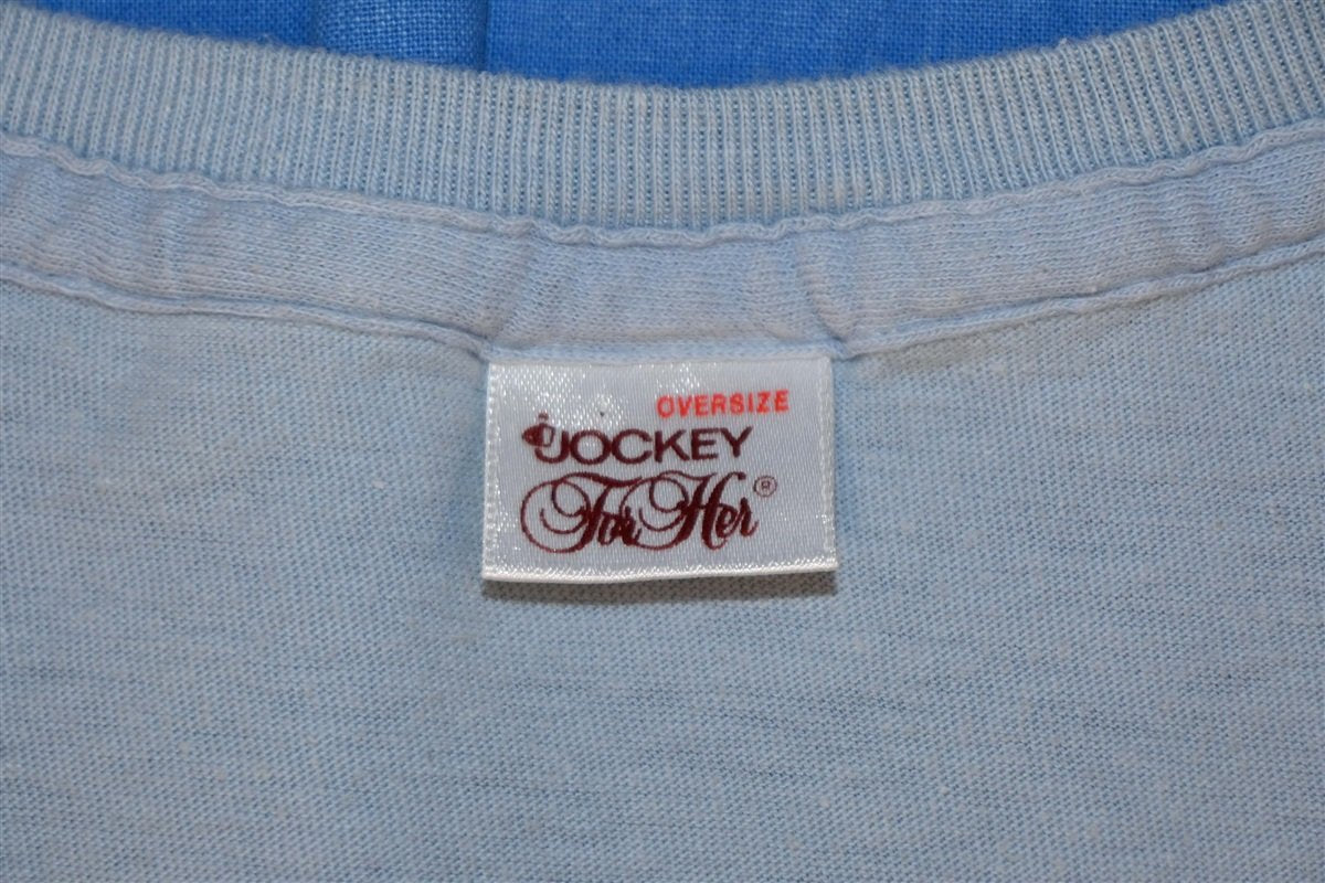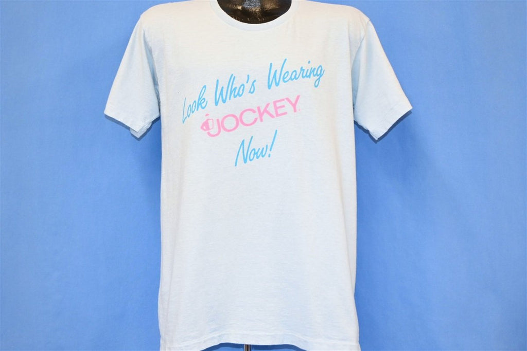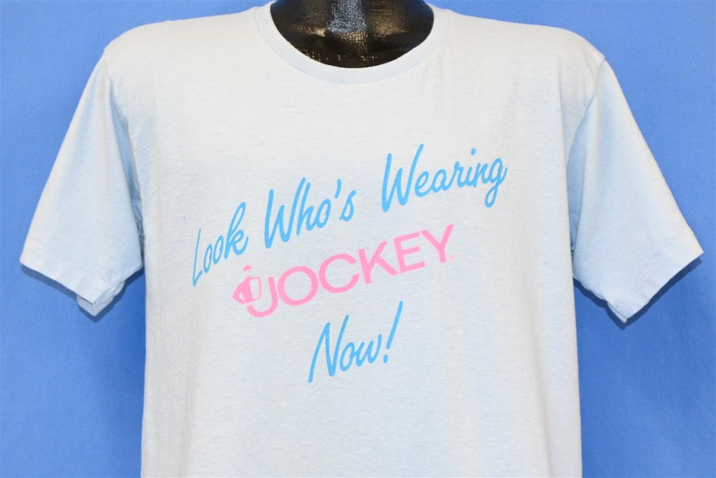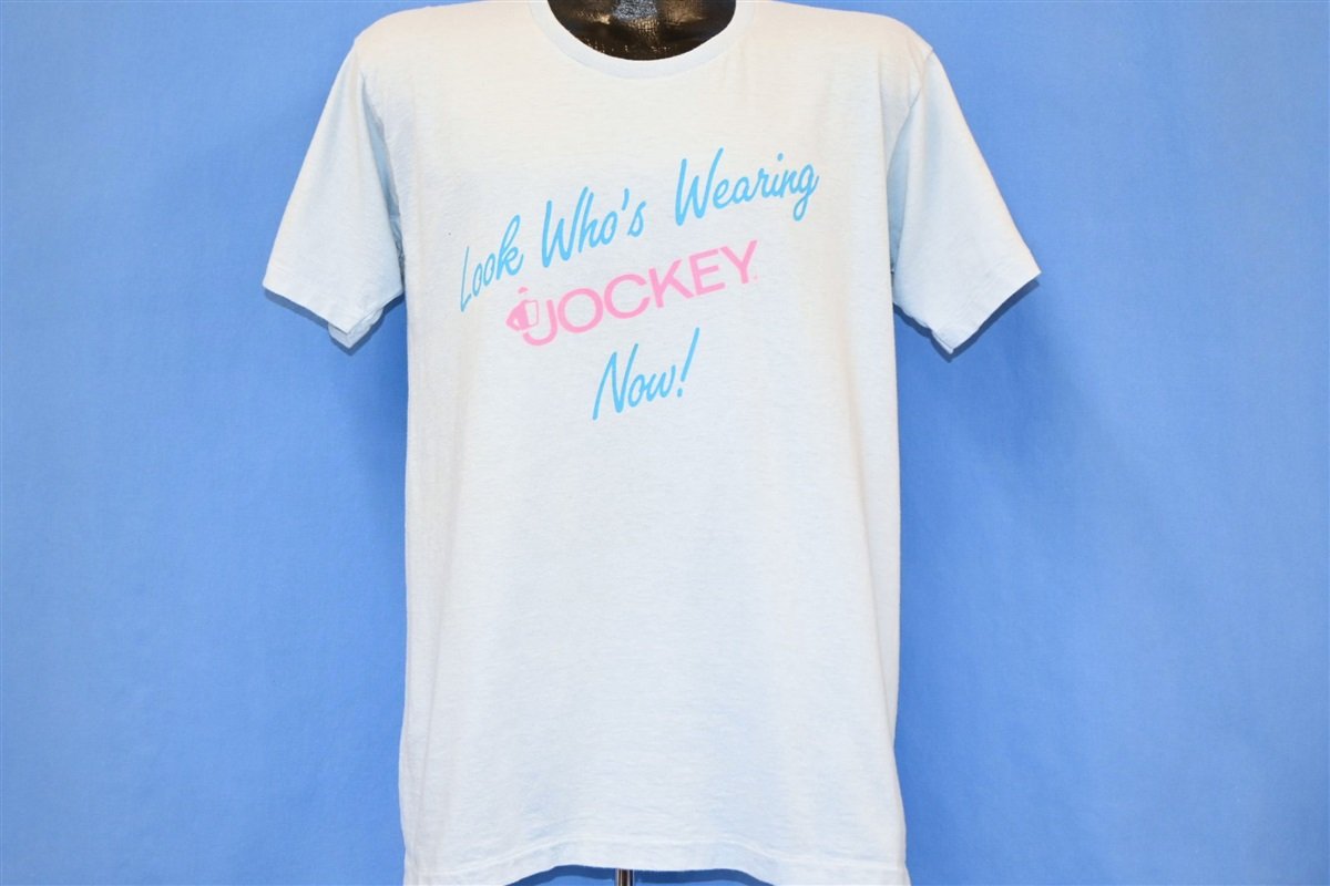 This cool tee was made to celebrate the brand Jockey expanding to women's wear. Jockey has been making men's underwear since the 30s, but they only introduced Jockey for Her in 1982. Jockey for Her was a huge success, and the company continued to create apparel for both men and women. This tee says "Look Who's Wearing Jockey Now!"