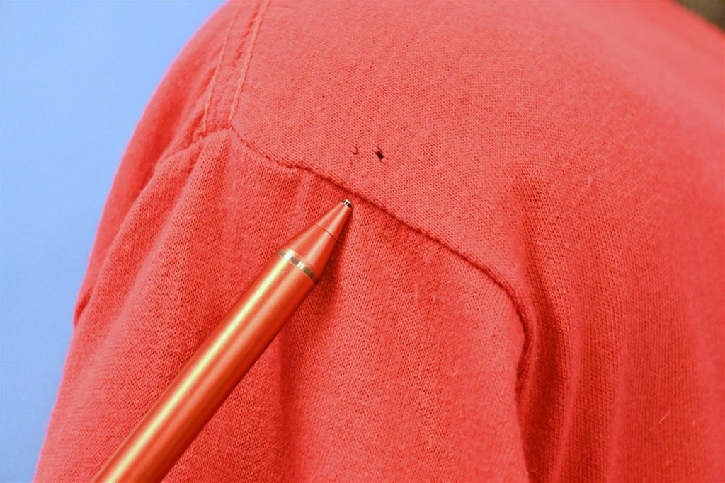 The tag says large but this shirt fits like a modern unisex adult medium. There is a small hole on the right shoulder when wearing, see pics.
