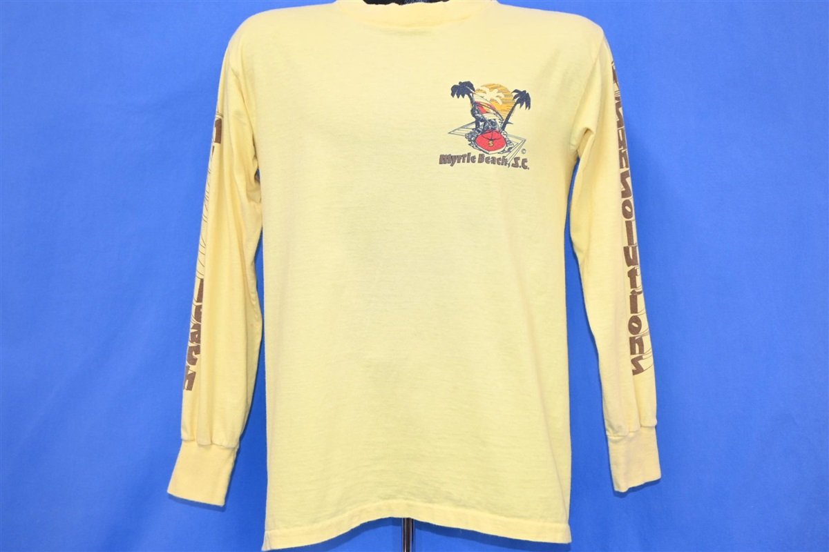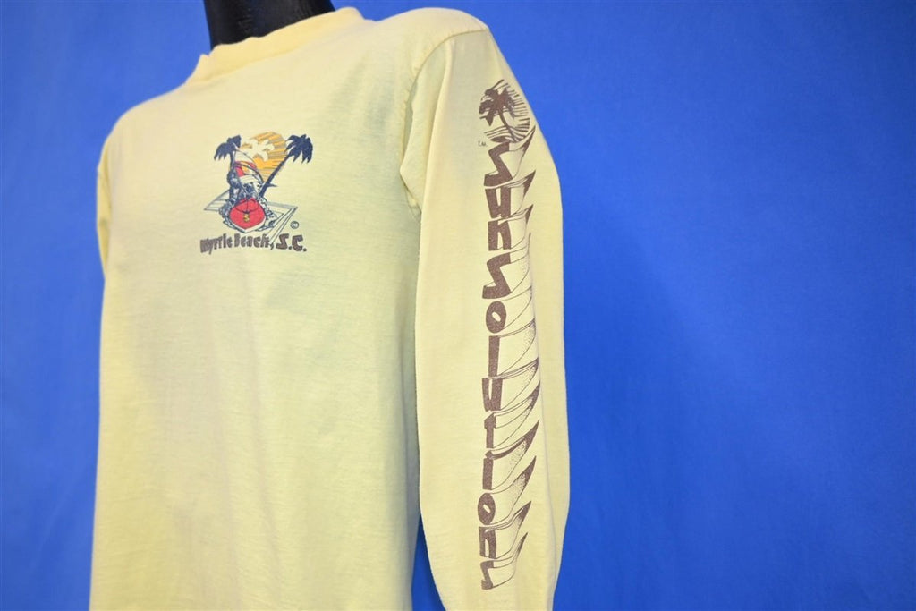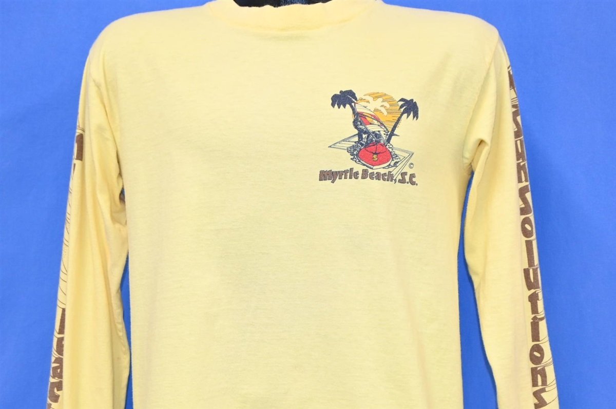 This awesome long sleeved tee is a souvenir from the beautiful Myrtle Beach in South Carolina, and it promotes Sun Solutions dark tanning product. Sun Solutions was created in the 70s, and the company sought to resolve a unique issue. The company was inspired by vacationers in Daytona Beach, who wanted a lotion that wouldn't just protect against the sun, but allow for optimal tanning and moisturizing to treat tanned skin.