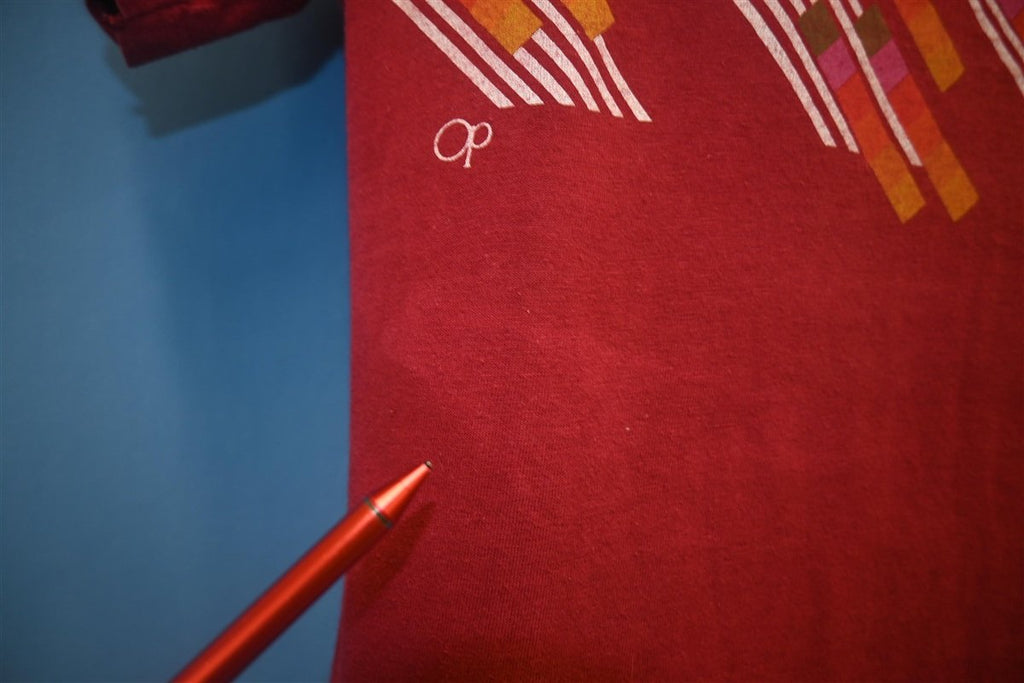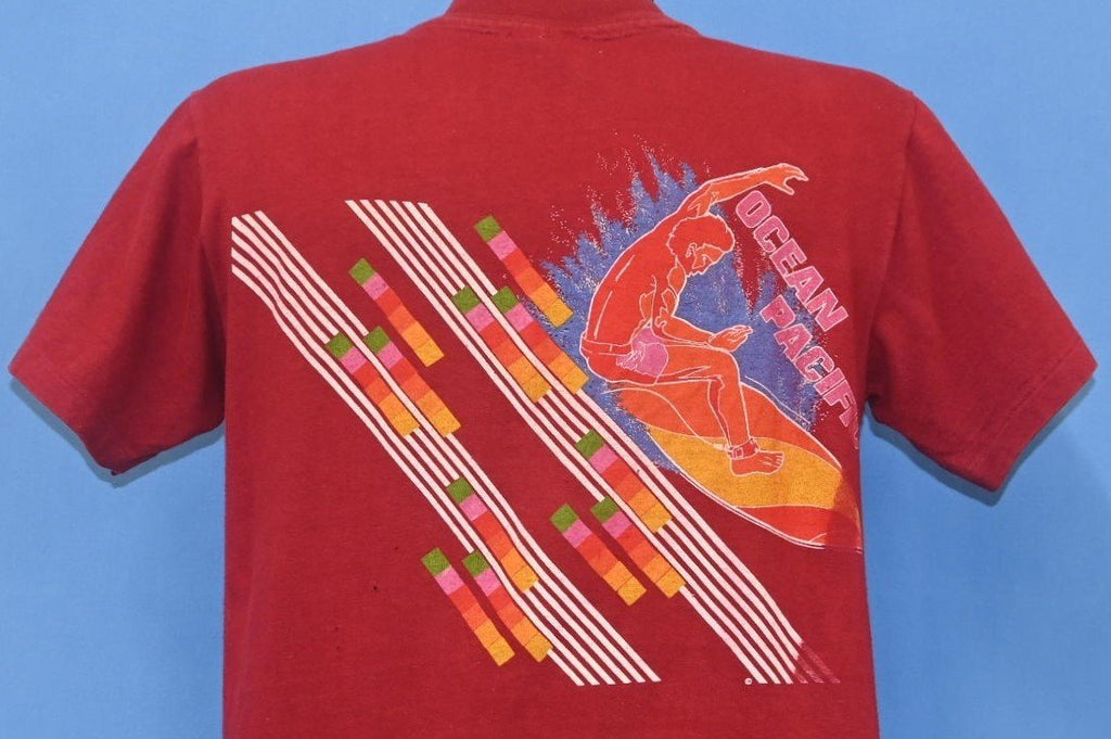 This colorful tee is a timeless surf shirt from the brand Ocean Pacific. Before becoming a well-known apparel company, Ocean Pacific began as a California surfboard brand that was eventually sold to Don Hansen of Hansen Surf Shop. Hansen then sold the trademark to Jim Jenks, who dreamnt of creating a sportswear brand that would cater to the demands of surfers both in and out of the water. Jenks' vision came to fruition as Ocean Pacific steadily became one of the biggest names in sportswear. This shirt was made in the 80s, the same decade that the company began hosting the OP Pro Surfing Championship in Huntington Beach.
