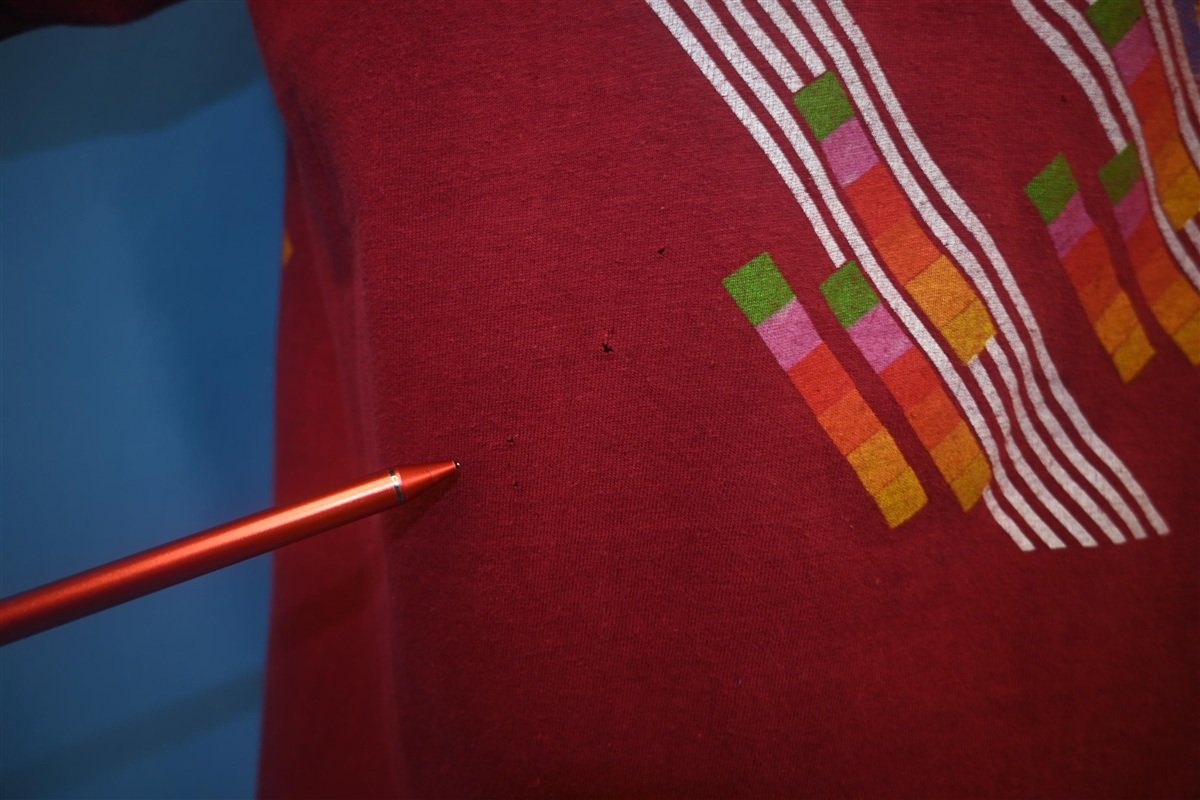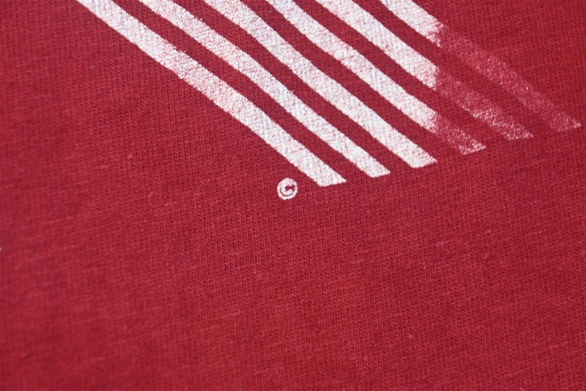 The tag says large but this shirt fits like a modern unisex adult medium. There are small spots and holes throughout, see pics.