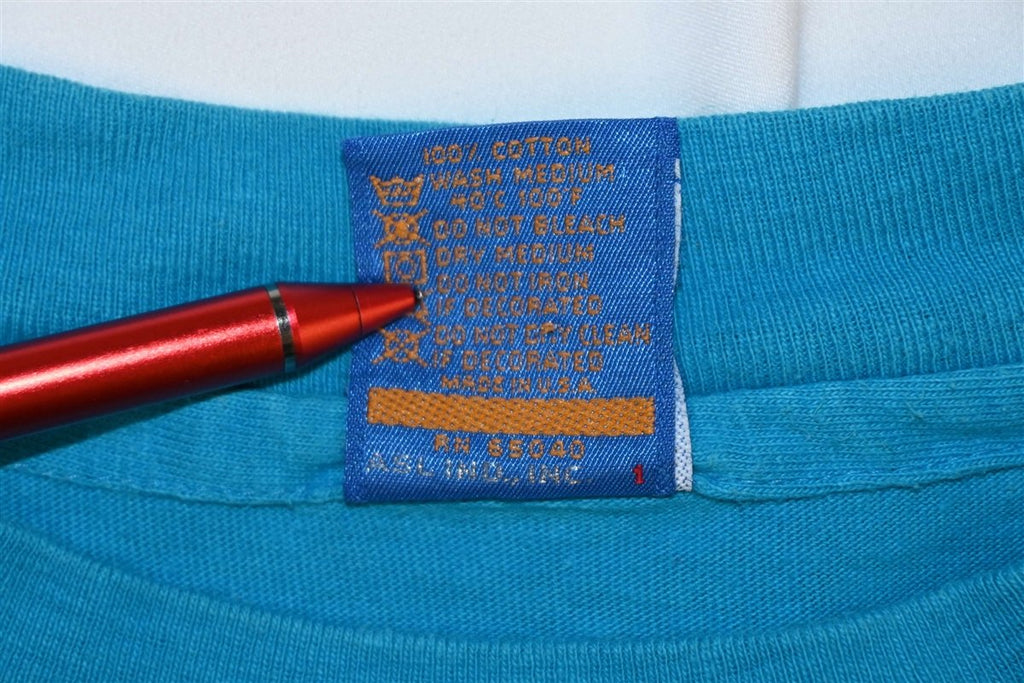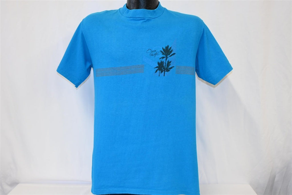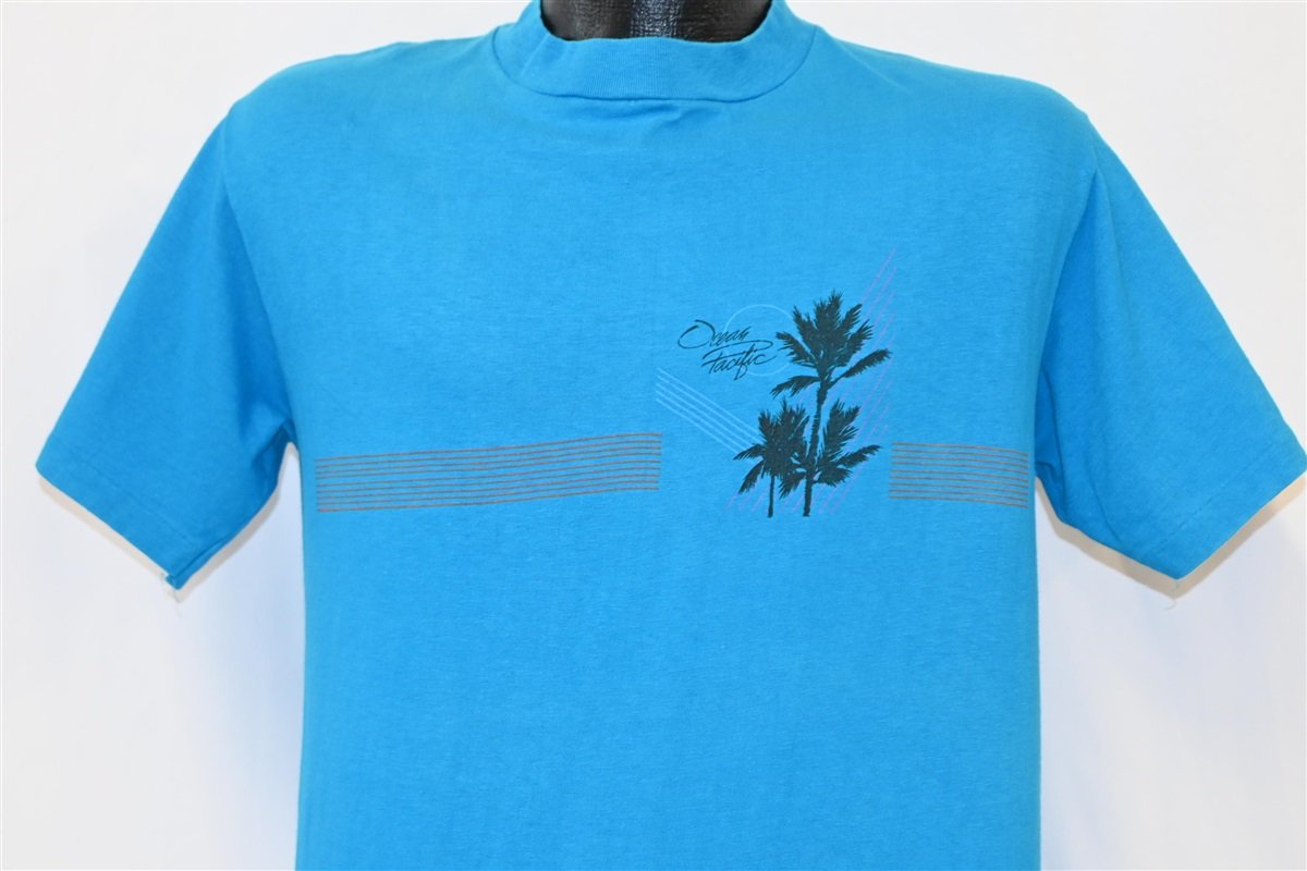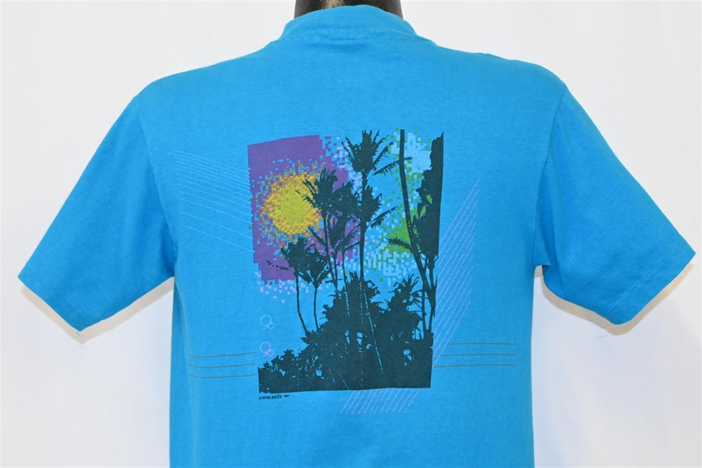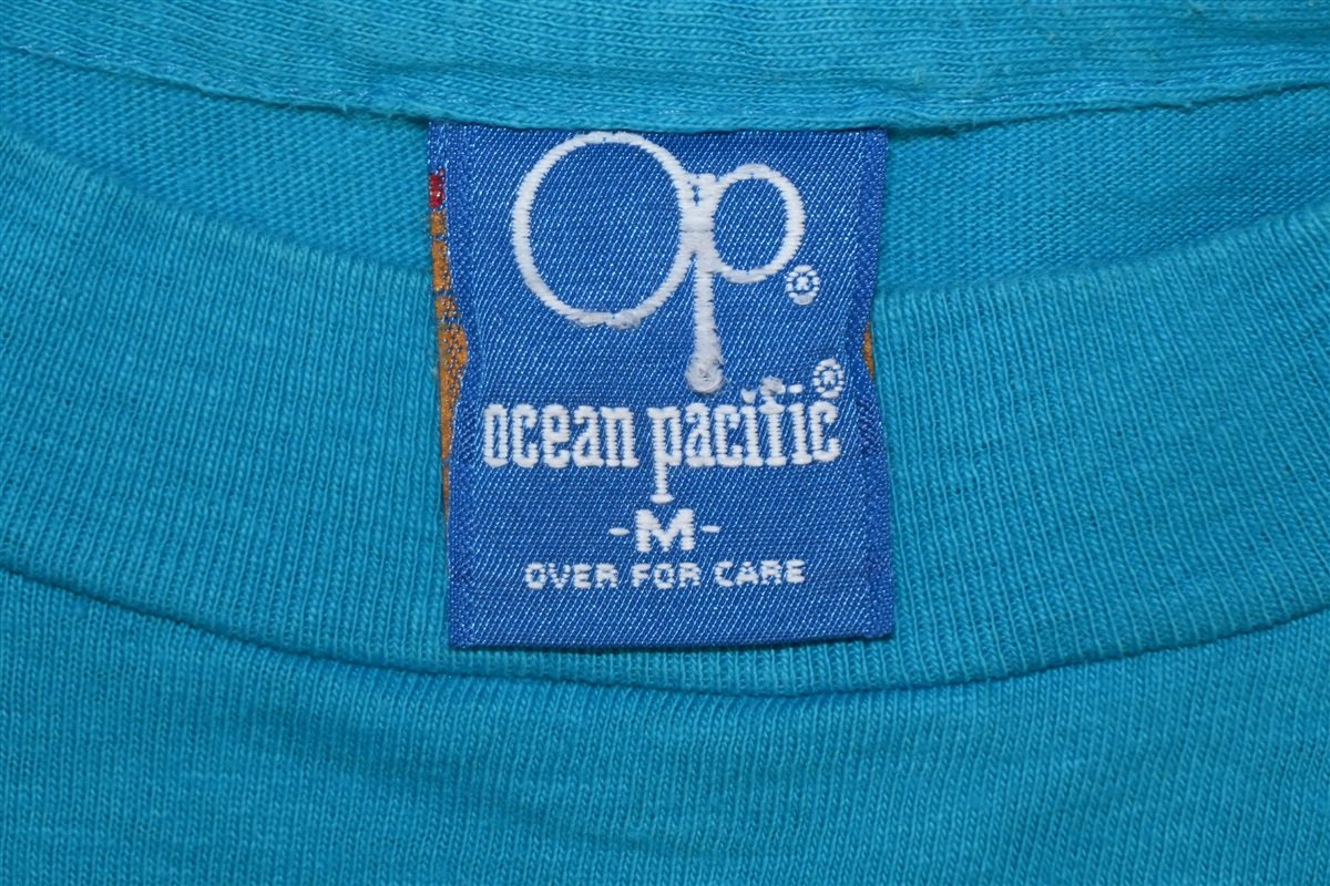This sweet piece of vintage surfwear was created by the popular brand Ocean Pacific, and the shirt features a palm tree design with horizontal stripes. The back meanwhile, showcases a larger graphic of a pixelated beach sunset. Ocean Pacific was originally the name of a surfboard brand in the 1960s, but it was later purchased by Jim Jenks in 1972, who was responsible for transforming it into the beloved apparel company it eventually grew into. Ocean Pacific is known for its OP logo and fashionable designs. This shirt was made in the 80s, and the graphics reflect the geometric and technology inspired aesthetics of the decade.