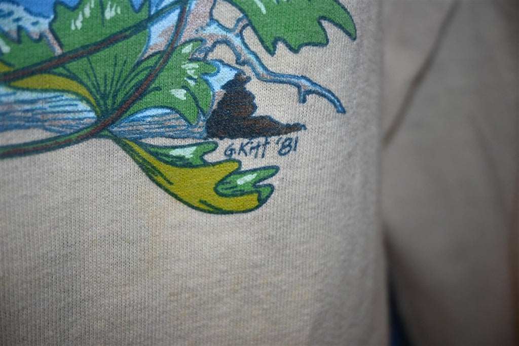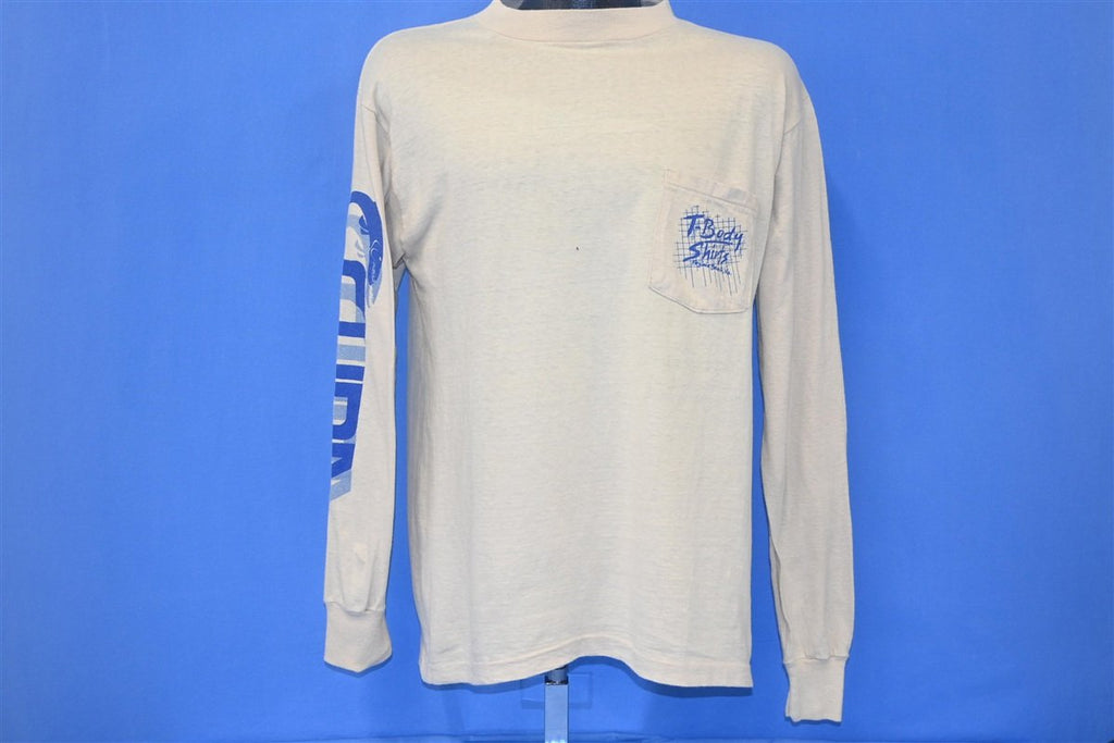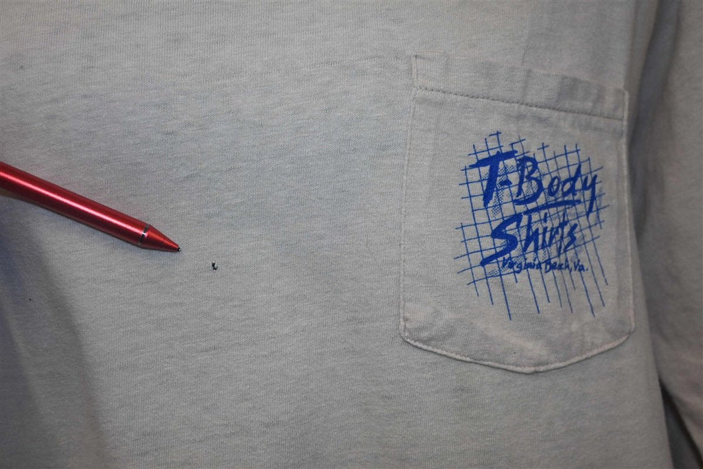 This awesome pocket tee was made by T-Body Shirts, an innovative screen printing business based out of Virginia Beach. The business was created by a duo of local lifeguards, Nabil Kassir and Edmund Ruffin, who became known in the 70s and 80s for owning some of the area's hottest nightclubs. One of these clubs was Peabody's, which used to sit above Peabody's T-shirt Business, the predecessor to T-Body Shirts. The company used to print custom shirts for local businesses, and they later expanded to have multiple outlets across the US.