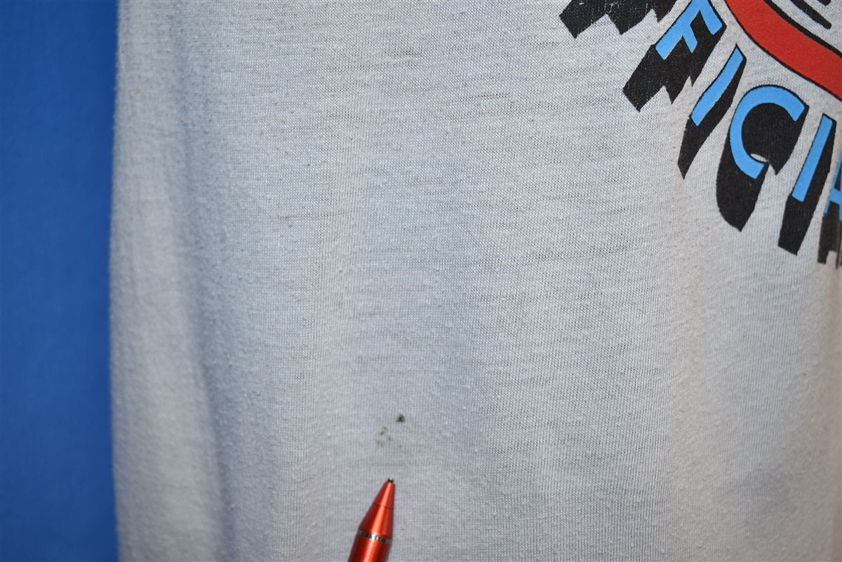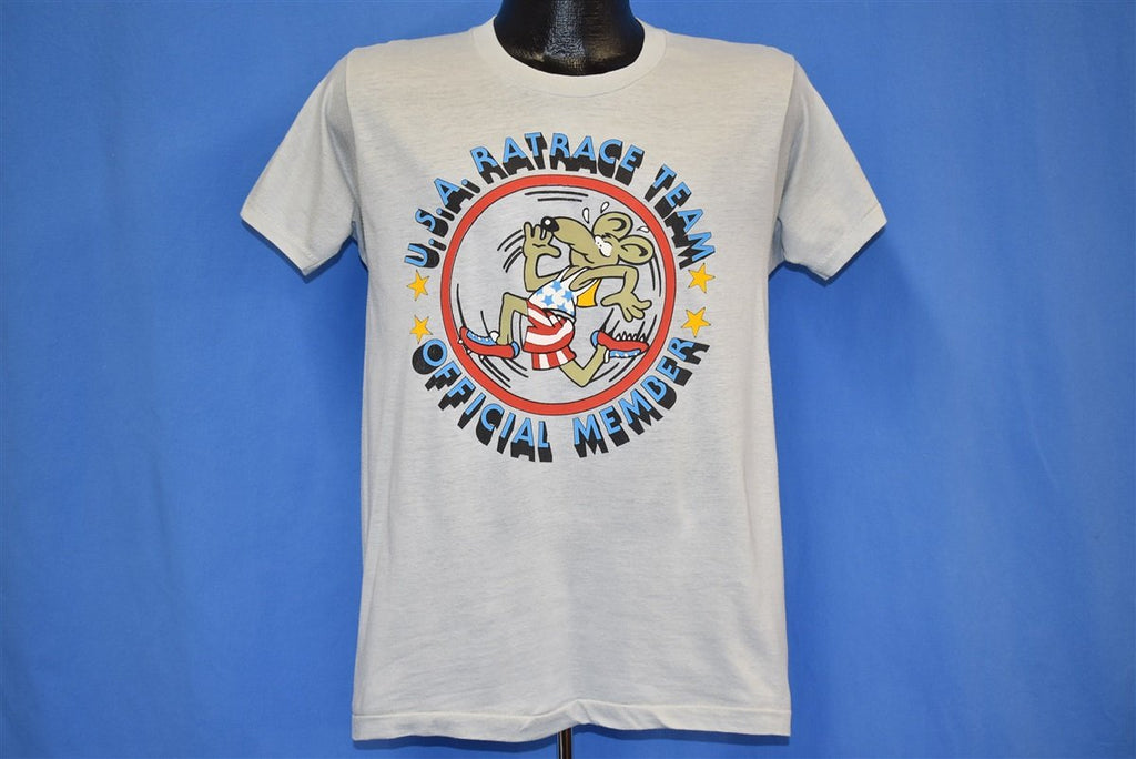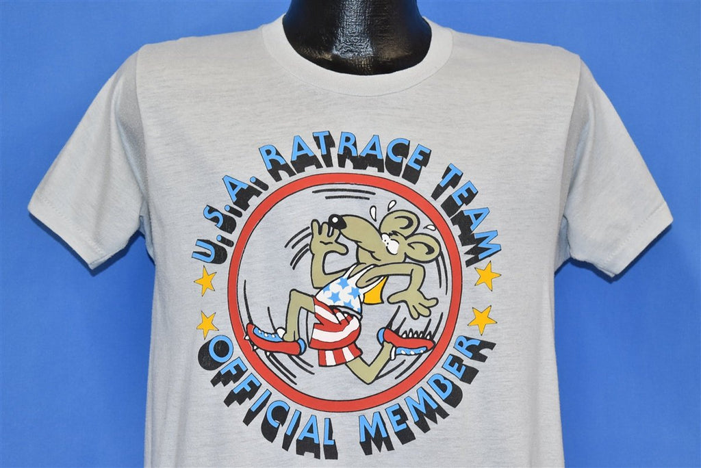 This joke tee is a parody or spoof on the timeless term "rat race", giving it a sense of prestige by assigning the rat race its very own team with "official members" as if it were the Olympics or an elite running club. It's a 1980s original loaded with cartoon graphics, soft cotton blend, and good old fashioned humor.