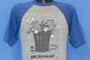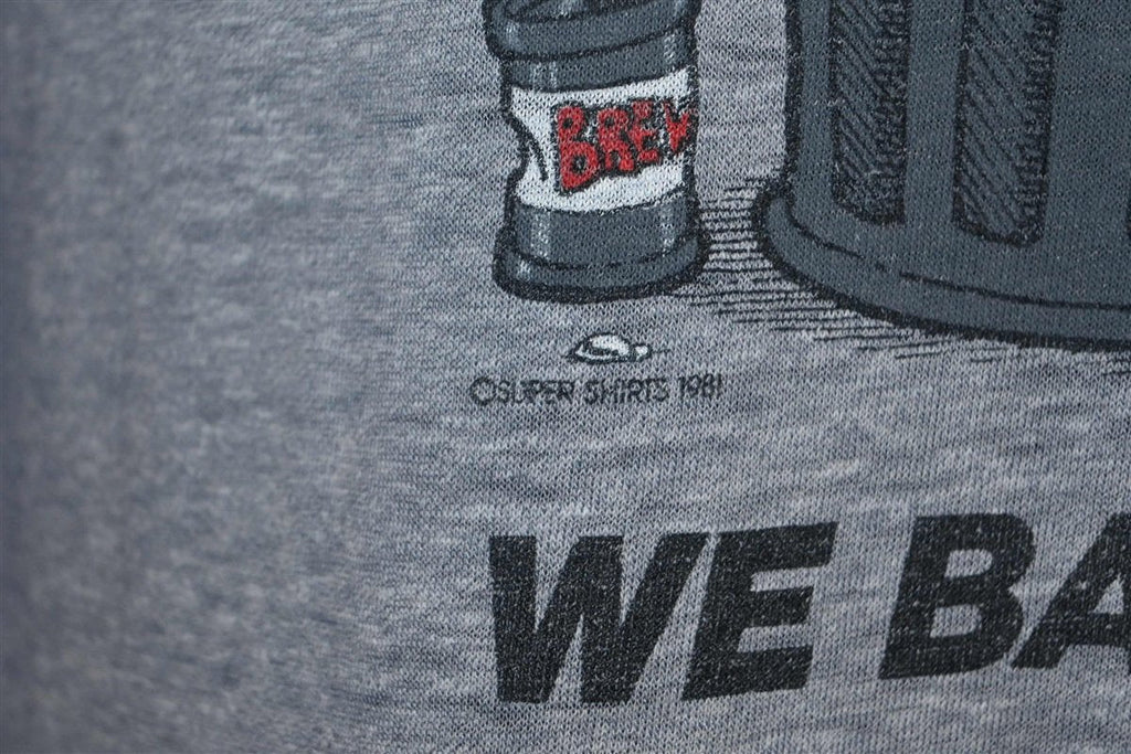 This super soft raglan has a humorous cartoon image of two bad kitties. The two tough alley cats are shown stuffed into a garbage can, while they partake in some cigarettes and beer. This tee was printed by Super Shirts in the early 80s, and the graphic is signed by an artist named J. Bates. Bates' quirky cartoon cats were featured on a number of Super Shirts tees during the 80s, making them something like the Super Shirts equivalent to the popular B. Kliban fat cat tees produced by Crazy Shirts.