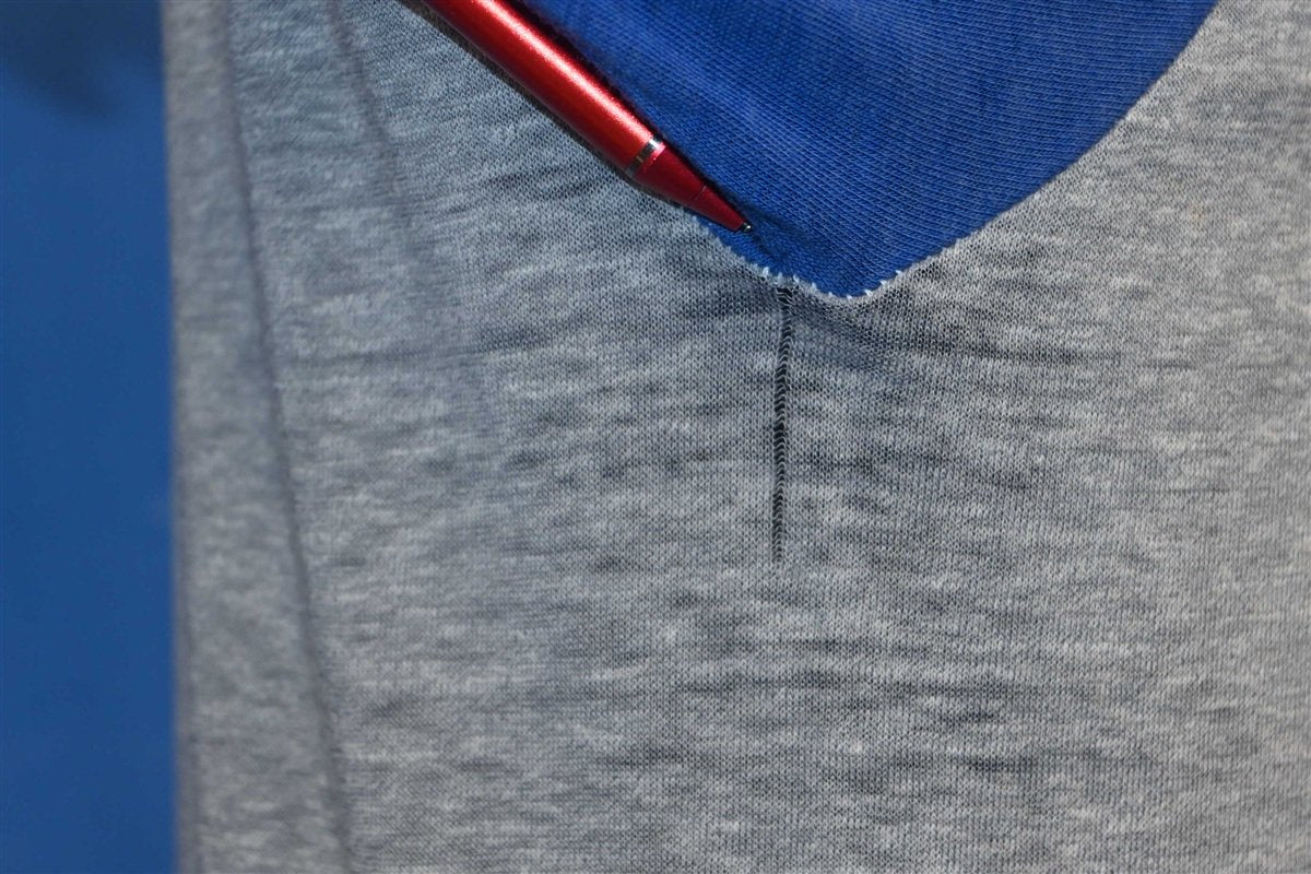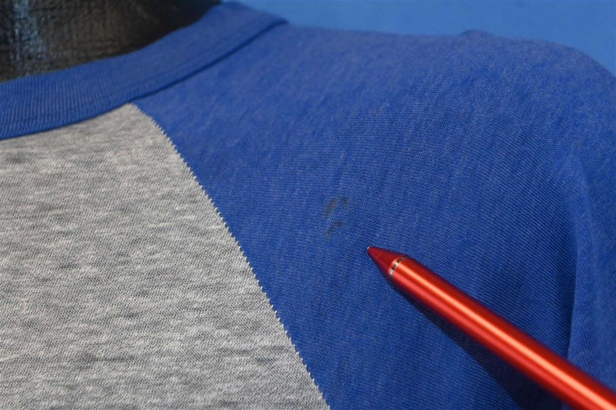 Fits like a modern unisex adult medium. This shirt is soft with some spots on the shoulder and a run in the right underarm when wearing, see pics.