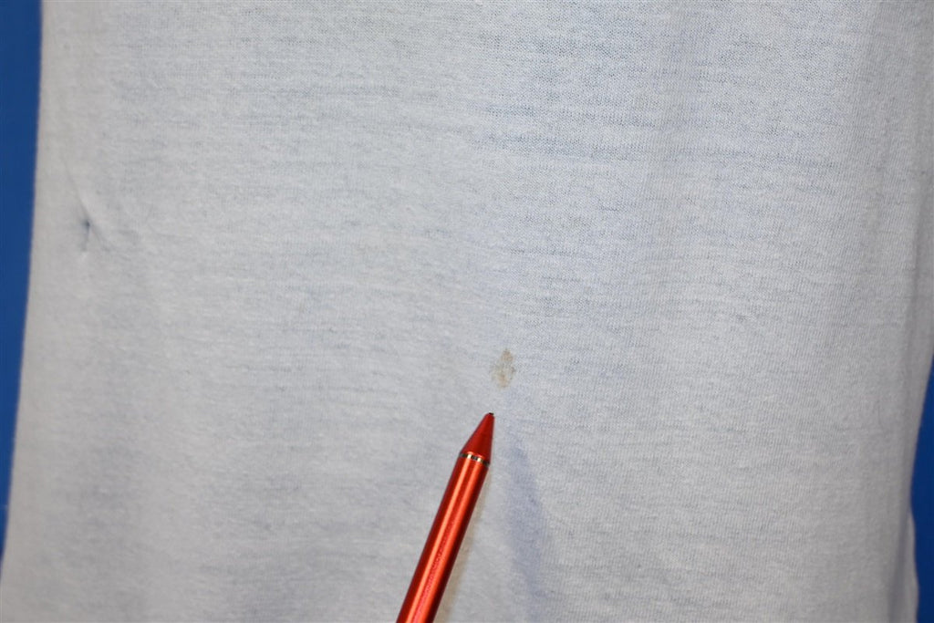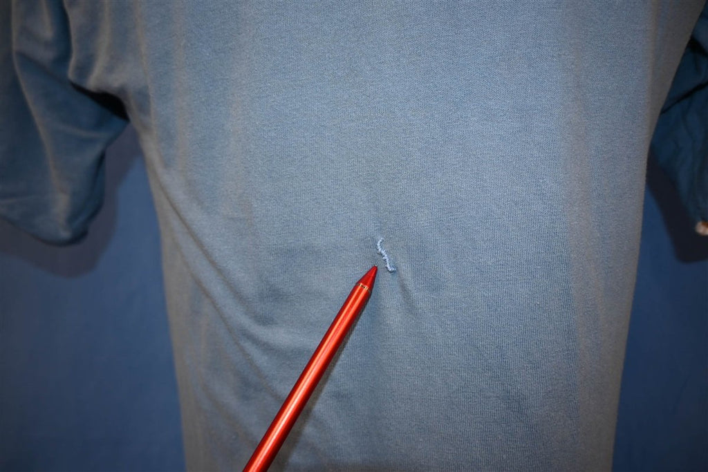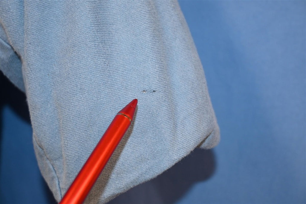 Fits like a modern unisex adult medium. There is a repair on front, hole on left sleeve while wearing, repair on center back, and a spot on front of shirt. Shirt is reversable.