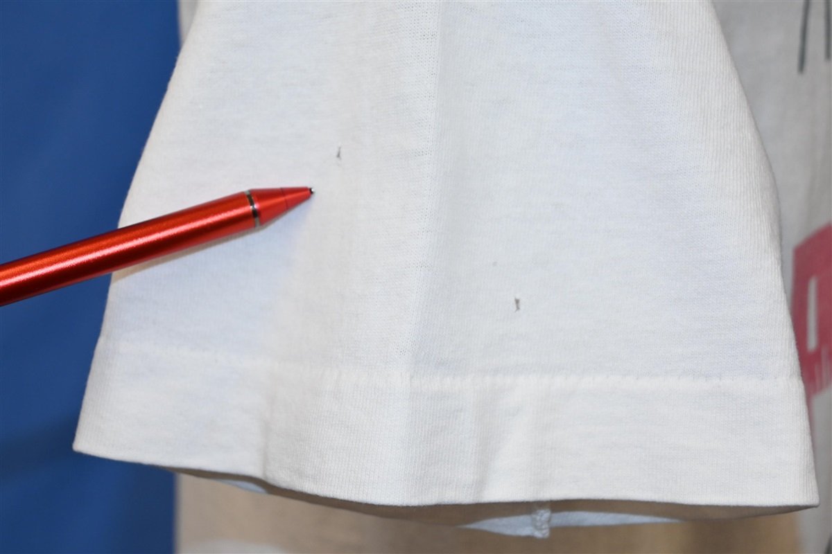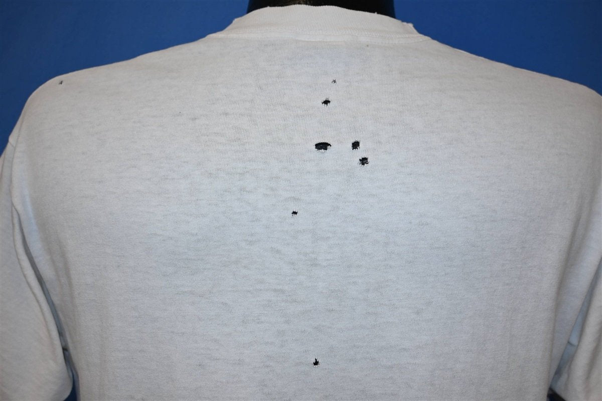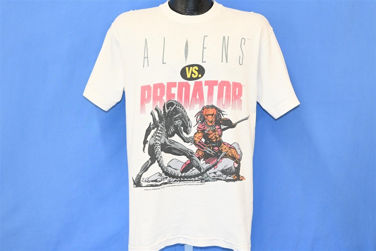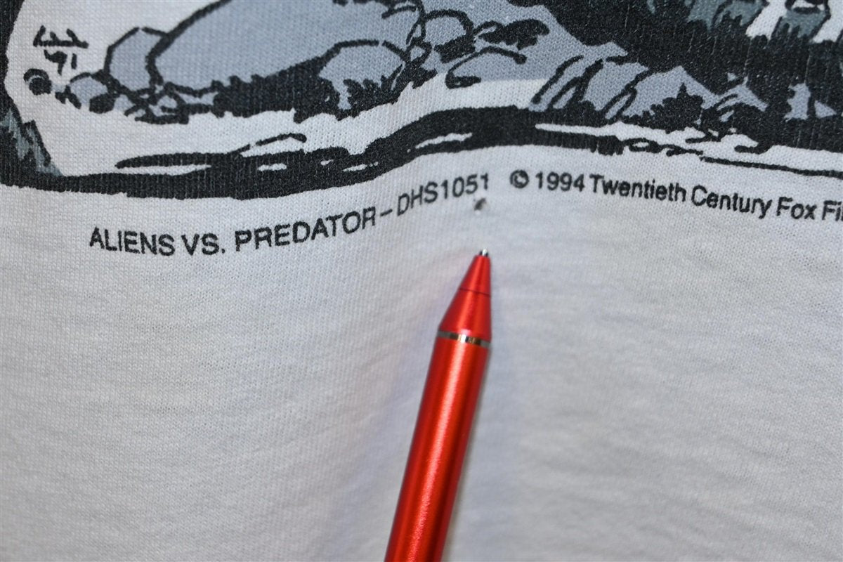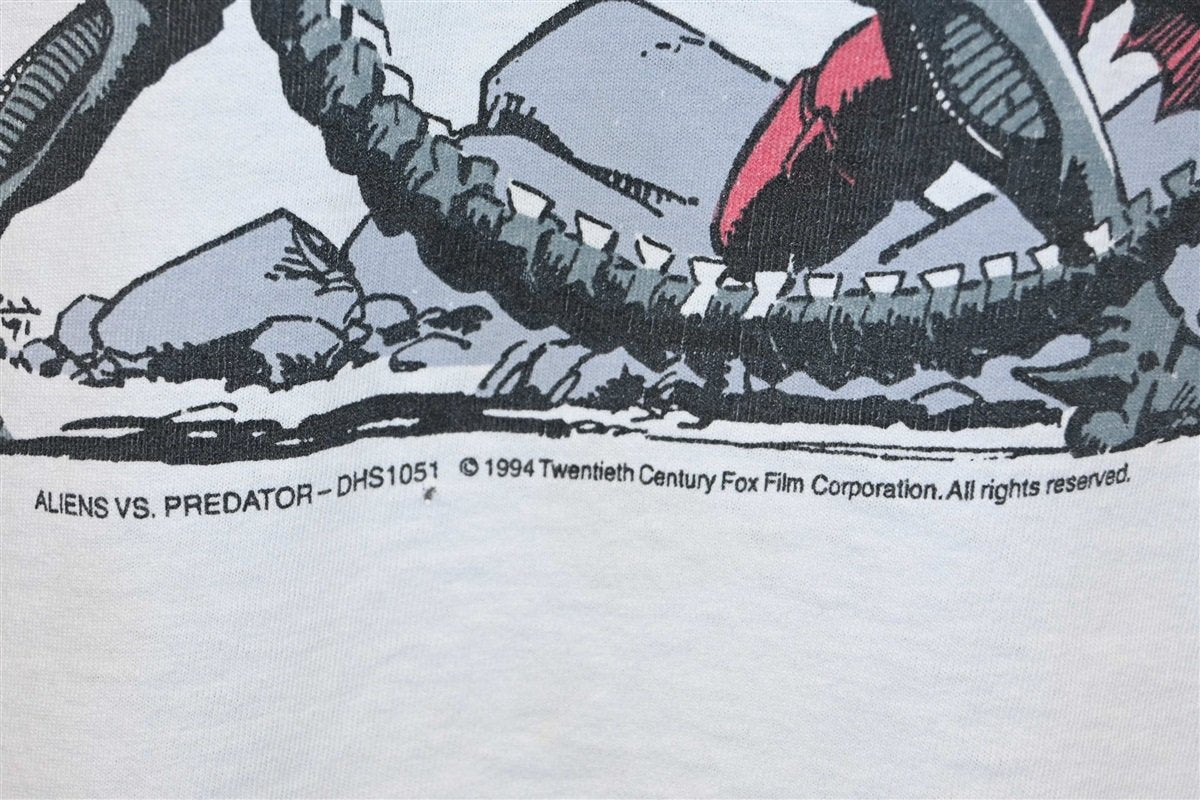This shirt is copyright 1994, a few years after the original Aliens vs. Predator story was released. The franchise was continued through various limited series, which in 1994 included Aliens vs. Predator: Deadliest of the Species and Blood Time. During that time, 20th Century Fox was also attempting to adapt the concept for film. The 1990 movie Predator 2 had already alluded to the comics becoming part of the cinematic canon, as one scene showed a Predator in possession of a xenomorph skull trophy. However, the movie wound up in development hell for over a decade, before it was finally brought to theaters in 2004.