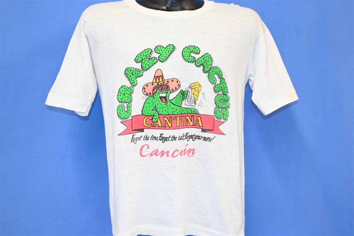 This cool shirt advertises a restaurant called the Crazy Cactus Cantina. Not much is known about this former eatery, but there's evidence of locations that were open in Cancun and Puerto Vallarta, two of Mexico's most popular vacation destinations. There's also records of a Crazy Cactus Cantina that used to operate in Hanau, Germany. This shirt features the same slogan that was used to promote all three locations, "forget the lime, forget the salt, forget your name!"