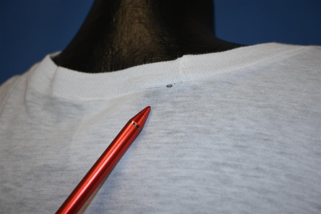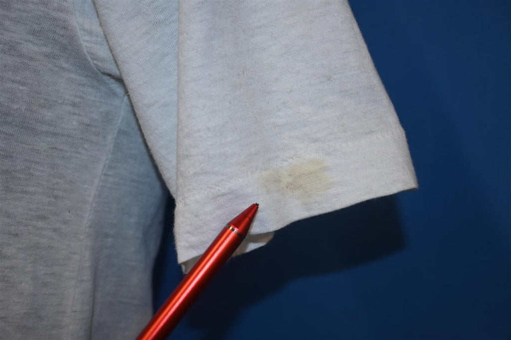 Fits like a modern unisex adult medium. There's a spot on the left sleeve when wearing and a small hole on the back, see pics.