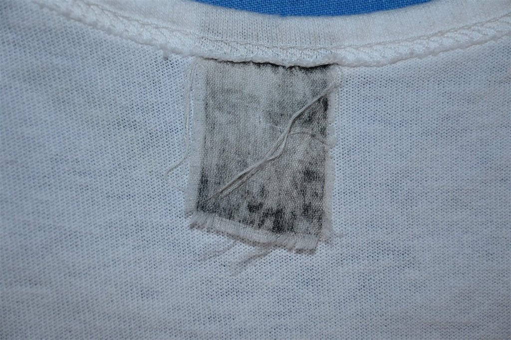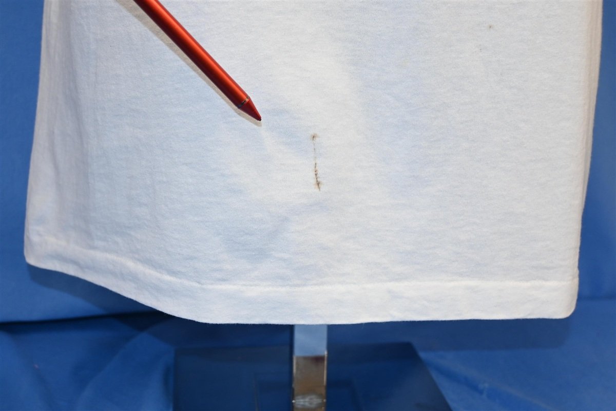 Fits like a modern unisex adult medium. There is some bleed throughout the graphic and a spot on the back, see pics.