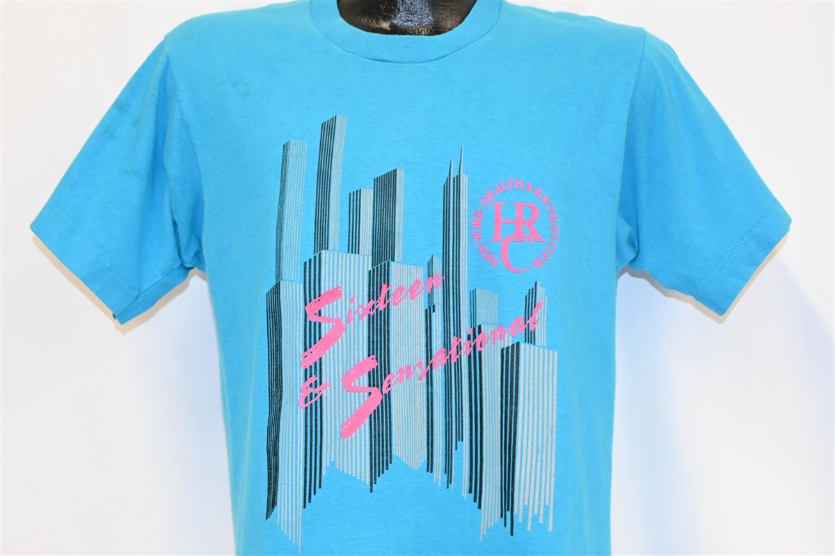 This vibrant t-shirt celebrates the sixteenth anniversary of the New York Health & Racquet Club, and it refers to the club as "Sixteen & Sensational". The NYHRC was first founded in 1973, and it used to operate several locations around Manhattan, which offered services like weekly fitness classes, steam rooms, and even a member yacht.