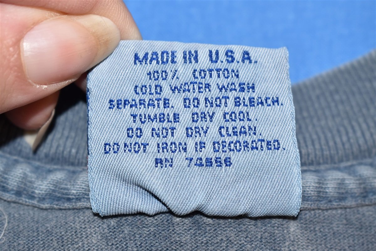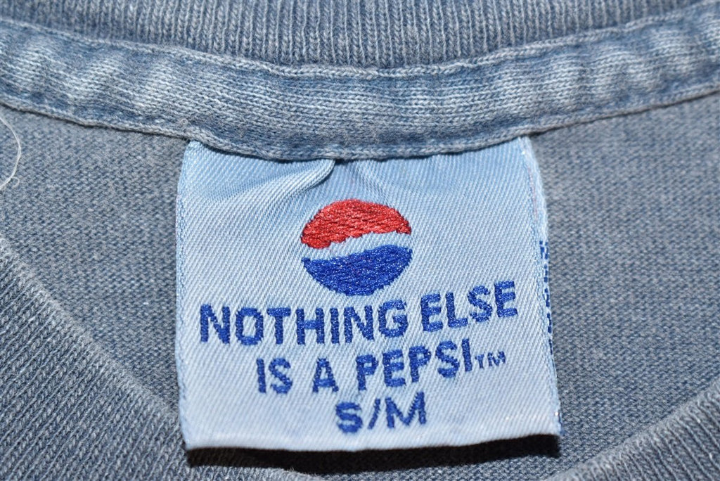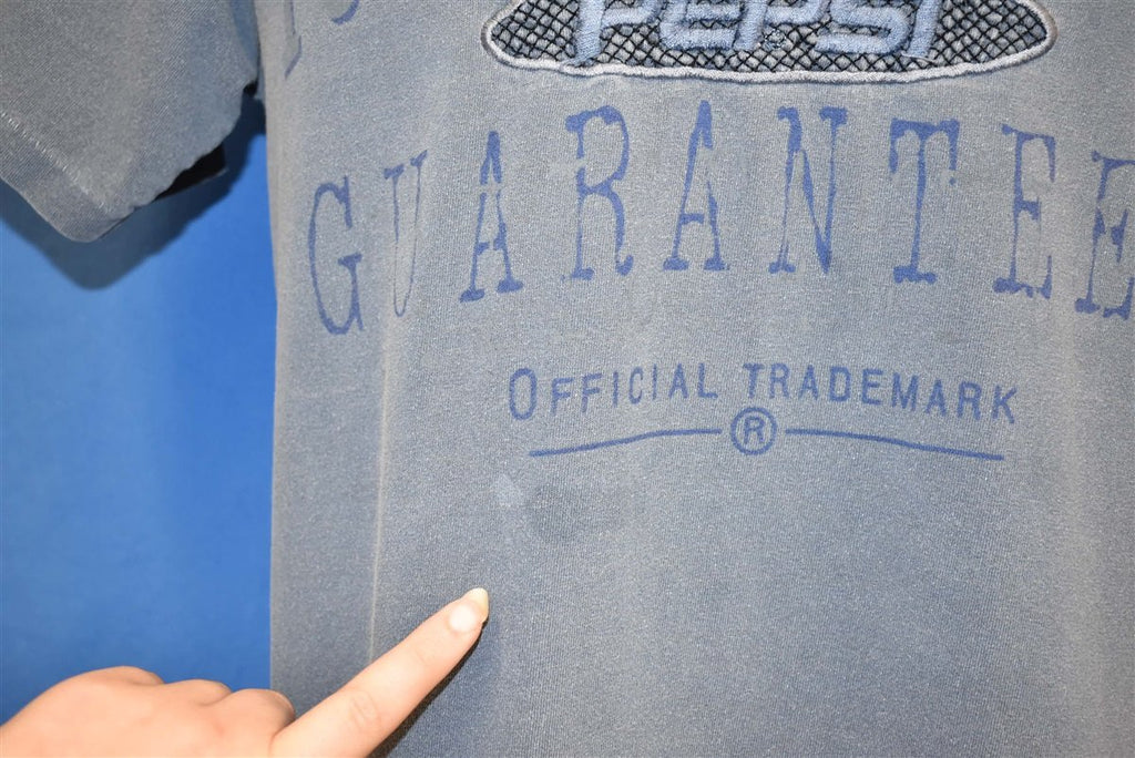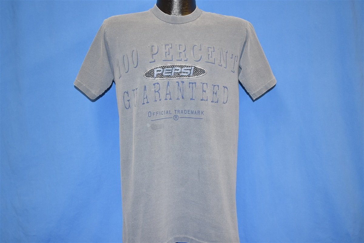 This grayish blue vintage tee is from the popular carbonated beverage company Pepsi and says, "100 Percent Pepsi Guaranteed". Pepsi was originally created in 1893 and first marked as Brad's Drink before the name was changed to Pepsi-cola.