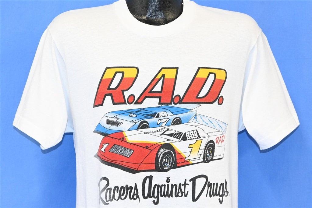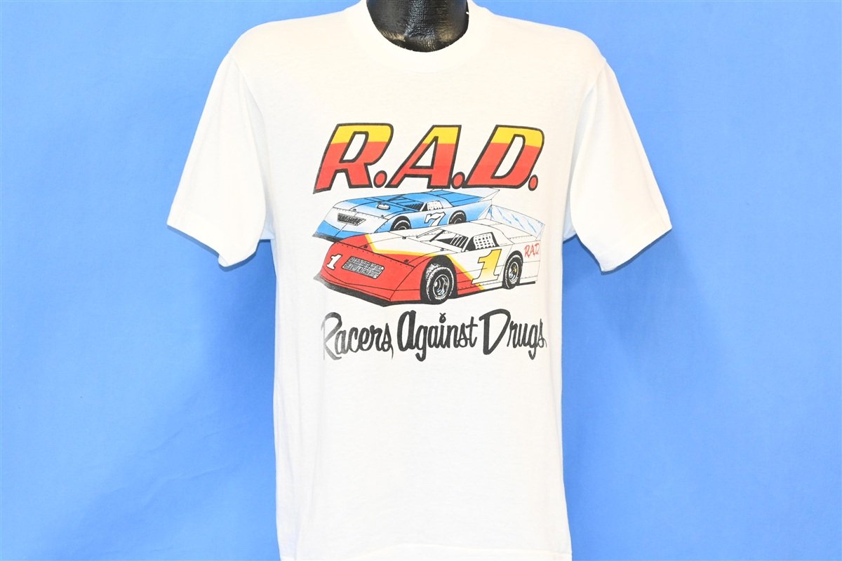 This sweet t-shirt promotes RAD or Racers Against Drugs, a national campaign dedicated to discouraging kids from recreational drug use. The program was enacted to take advantage of children's interest in the exciting world of motorsports. The hope was that kids would respond better to an anti-drug message if the sentiment was presented by one of their favorite racers.