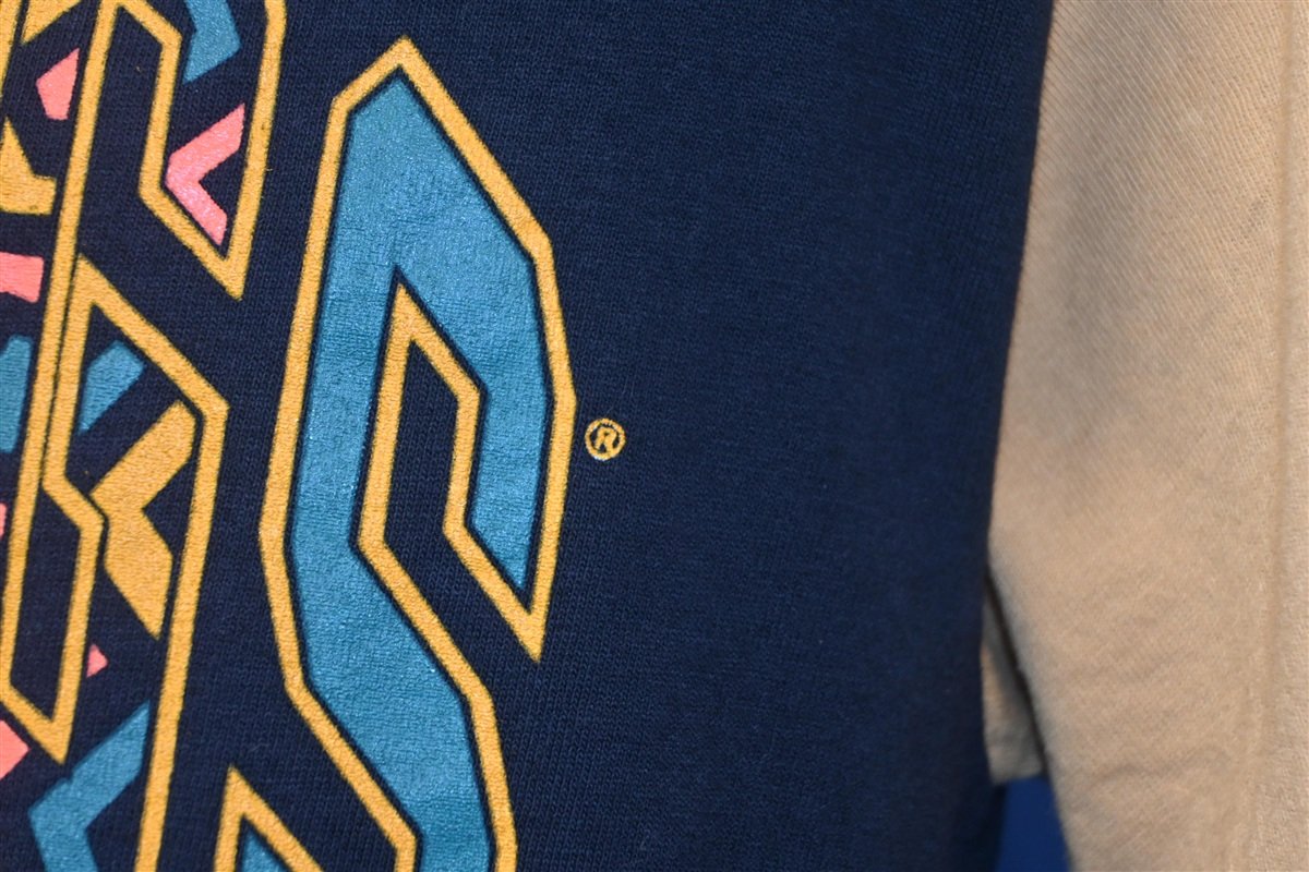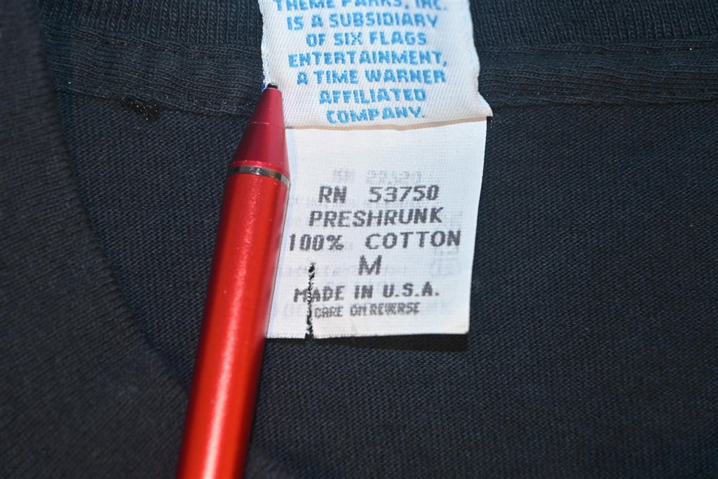 This sweet shirt is a souvenir from one of the numerous Six Flags theme parks scattered across the US. This shirt has a stylish colorblocked design and bold lettering that takes inspiration from the geometric patterns often found in African mudcloth. Based off the colorful design, it might be safe to assume that this tee celebrates what eventually came to be known as Six Flags Discovery Kingdom in California. This location originated as Marine World/Africa USA, before it was bought by Six Flags. After it was added to the Six Flags chain, the park still maintained much of its African themeing, which was in line with its multiple live animal attractions.