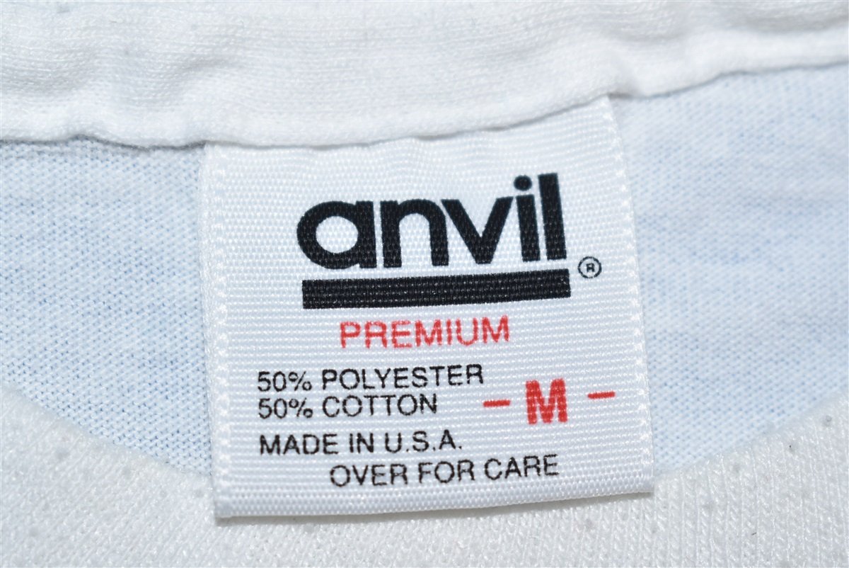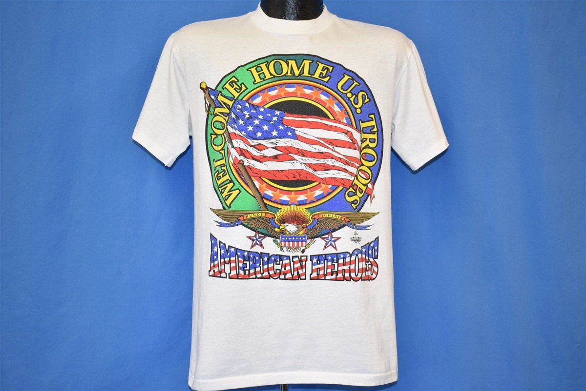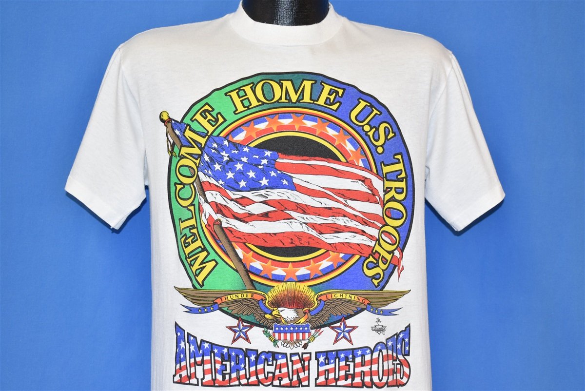 This vintage tee pays tribute to American troops as they return from active duty. It perfectly captures the patriotic spirit of the USA featuring images of the flag, the American bald eagle, and the iconic stars and stripes. The tee is a 1990s original with soft poly cotton, a classic Anvil tag, and awesome graphics.