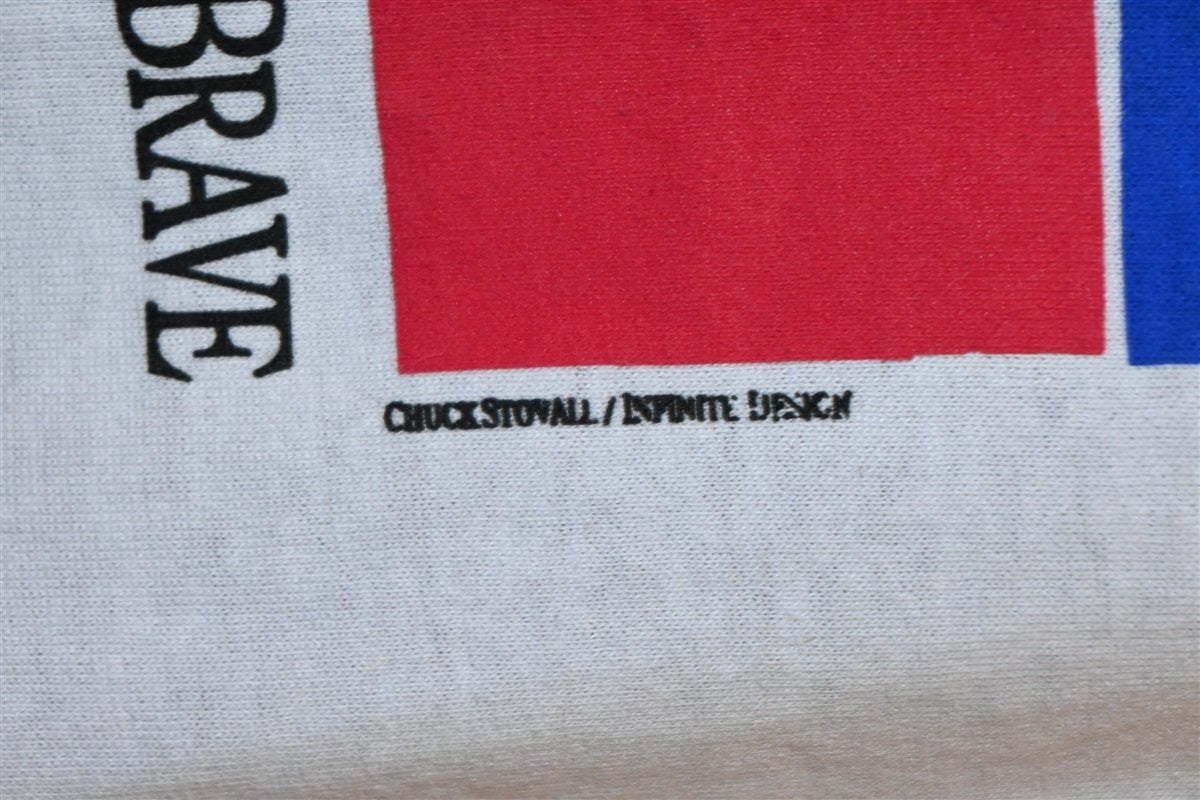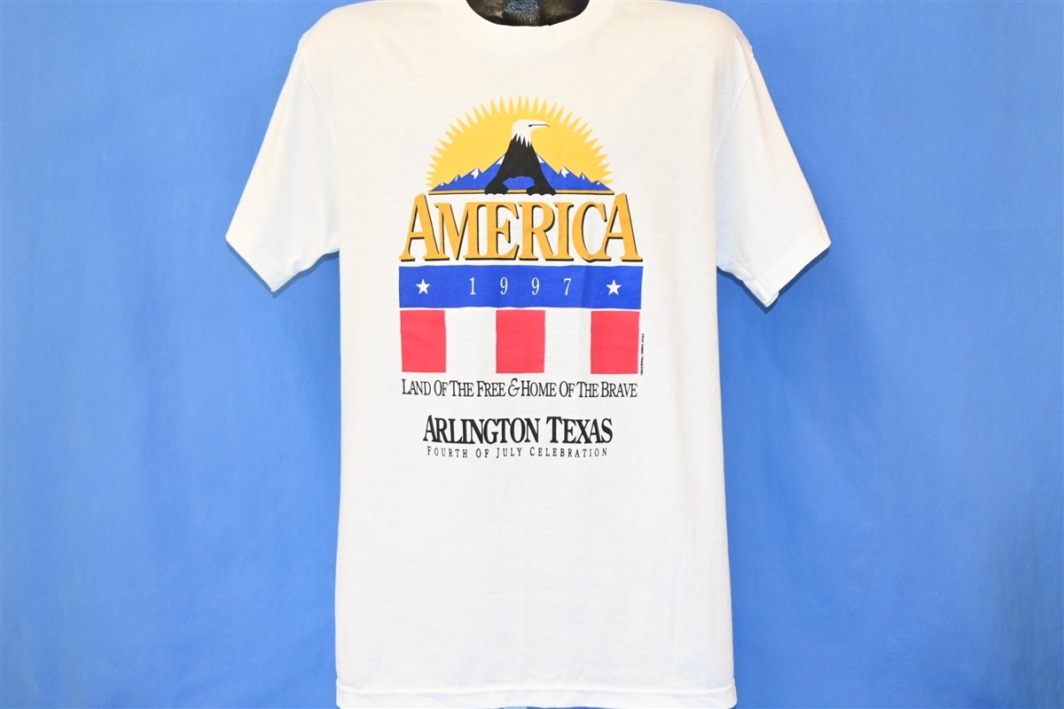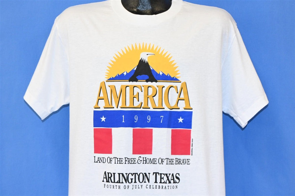 This awesome, patriotic tee is from a 1997 Fourth of July celebration that took place in Arlington, Texas, and the shirt proudly refers to America as the "land of the free, home of the brave". Like many cities across the nation, Arlington has several celebratory traditions that are held each July 4th. The two most popular annual events are the Arlington 4th of July parade and the fireworks display.