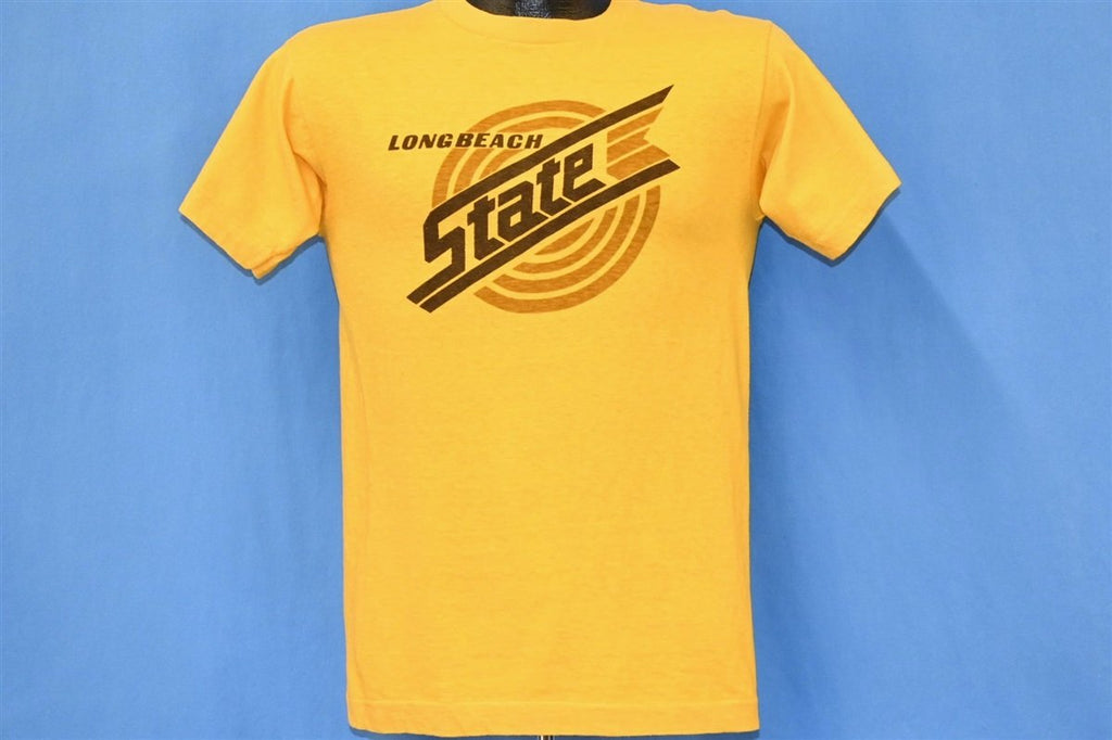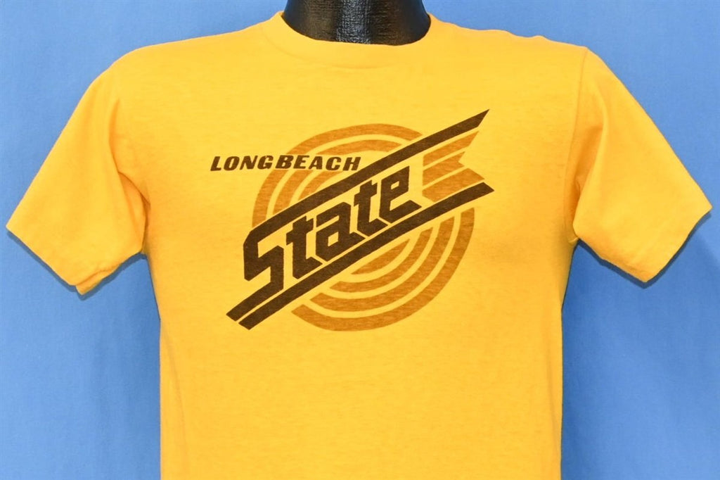 This sweet vintage shirt was made by Champion in the 70s and it has a cool graphic that proudly reads, "Long Beach State". Long Beach State is the nickname given to the athletic teams of California State University, Long Beach, a notable member of the California State University system. At one point, the school was home to the Long Beach 49ers, in honor of the 1849 California gold rush, but the university's athletic teams later became simply known as the Beach.