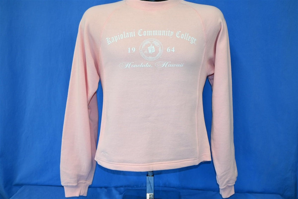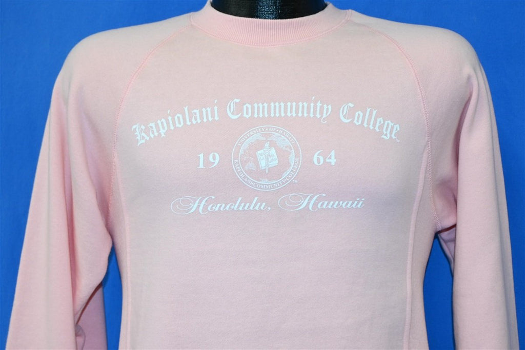 This cozy light pink sweatshirt was made in the 80s, and although it doesn't have a tag, the shirt does bear the Jansport logo embroidered onto it. The sweatshirt is from the University of Hawaii Kapiolani Community College, also formerly known as Kapiolani Technical School. The public community college is found in Honolulu and it was initially established as a vocational school specializing in food service.