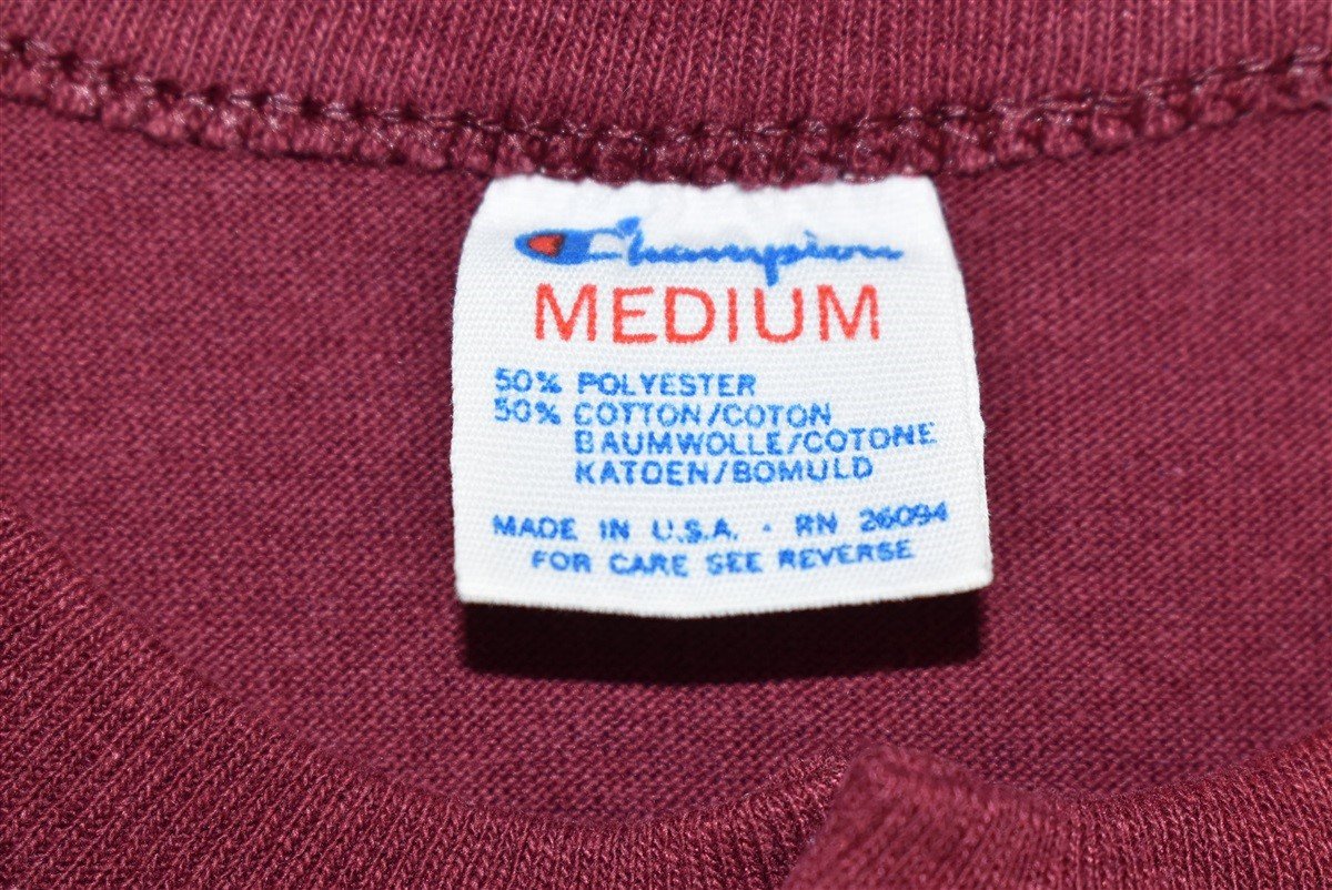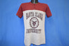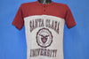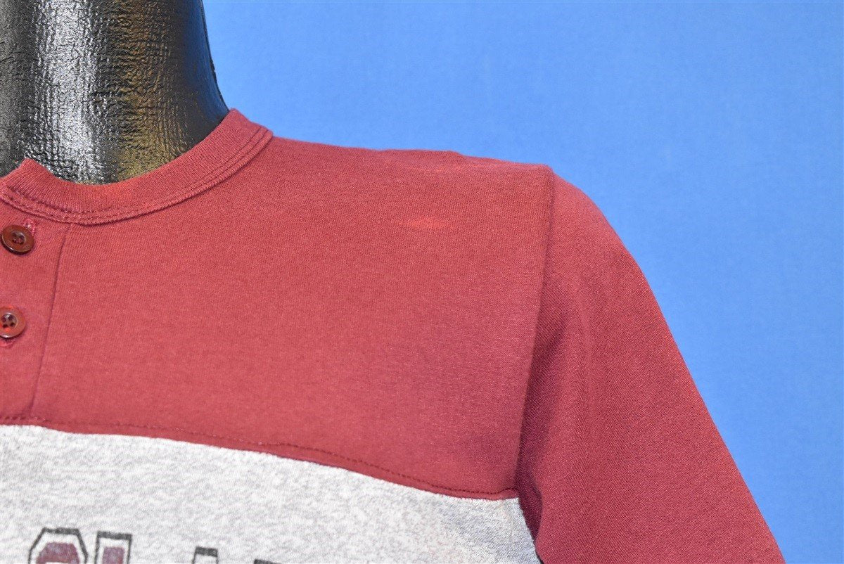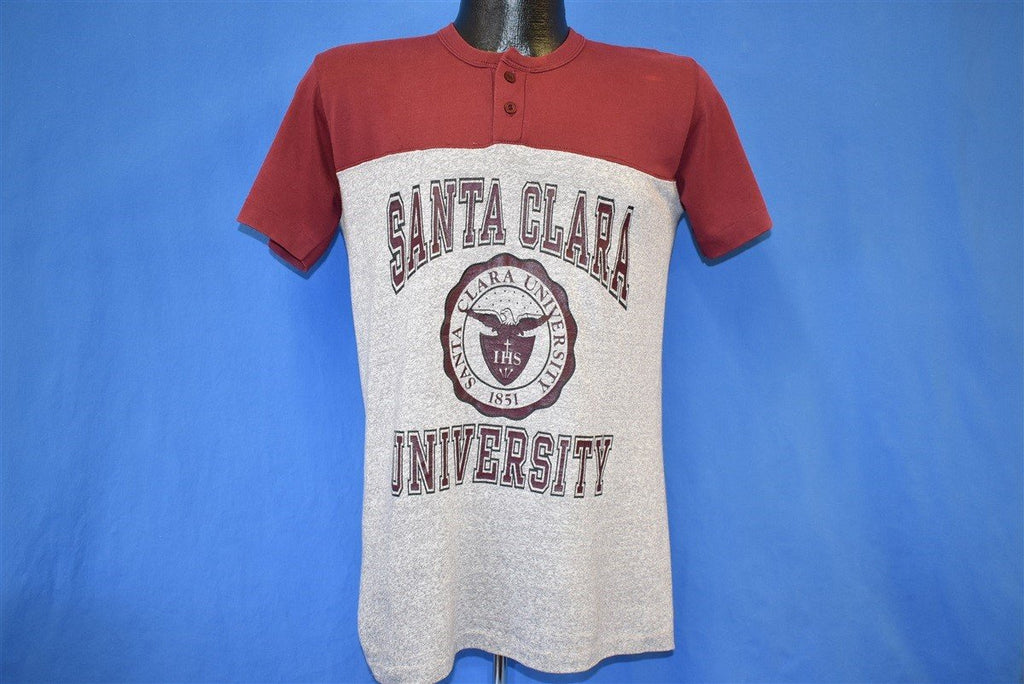 This 80s maroon and gray college henley tee comes from Santa Clara University in California. The school crest is centered on this tee, featuring an eagle and stars above the letters, "IHS," as SCU is a Jesuit University.