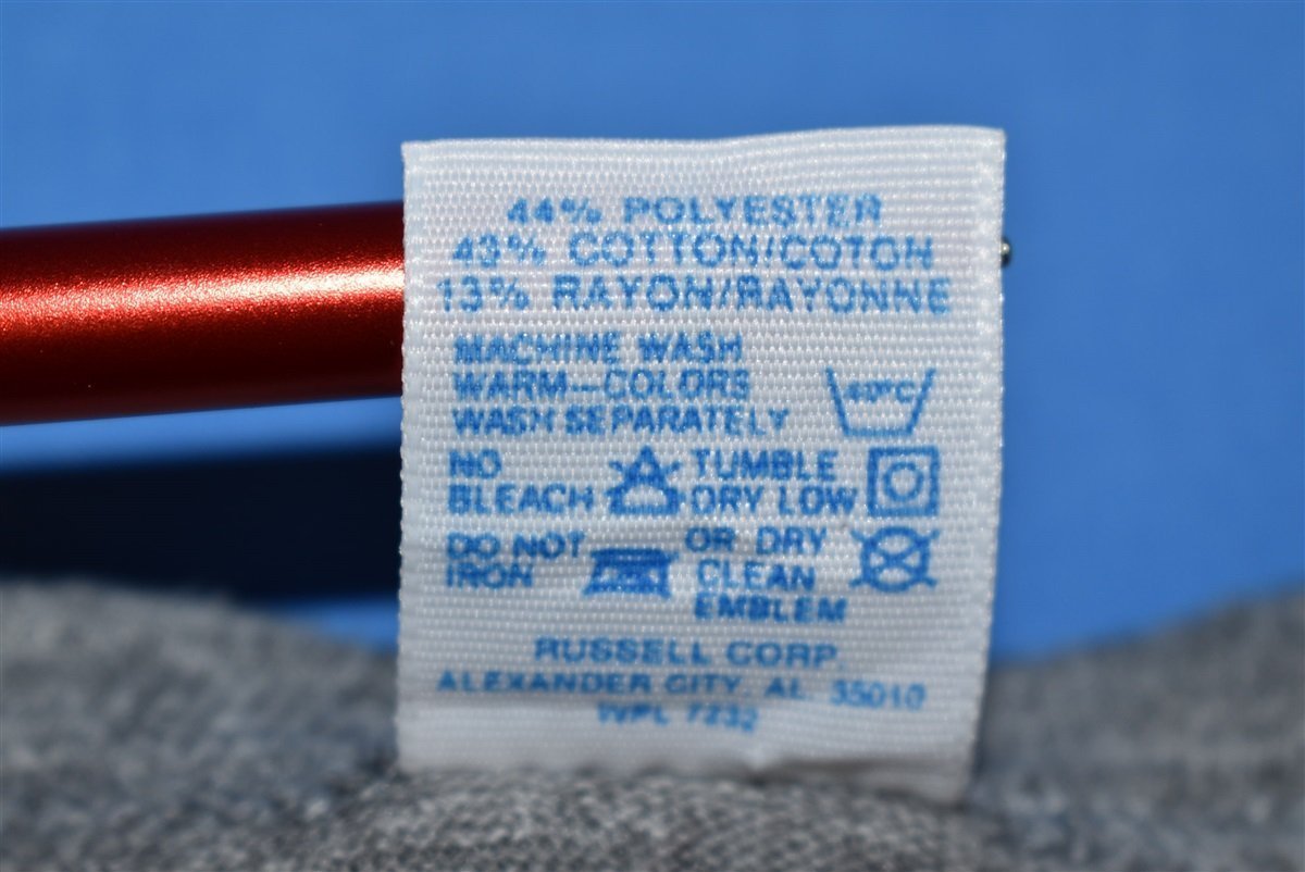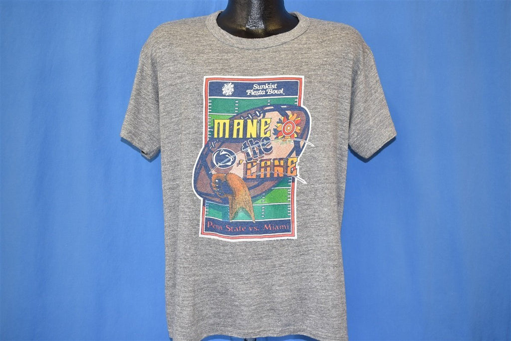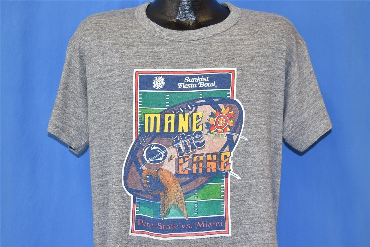 This tri-blended college football tee is to commemorate the Sunkist Fiesta Bowl and includes the phrase "Mane the 'Cane". The shirt is likely from the 1987 bowl when the Miami Hurricanes faced off against the Penn State Nittany Lions. The Fiesta Bowl closed out the 1986 NCAA Division I-A football season and it also served as the National Championship Game, determining the Championship winner between the No. 1 ranked Hurricanes and the No. 2 ranked Nittany Lions. Penn State ended up winning the bowl with a final score 14 to 10 granting them the No. 1 ranking and the national championship.