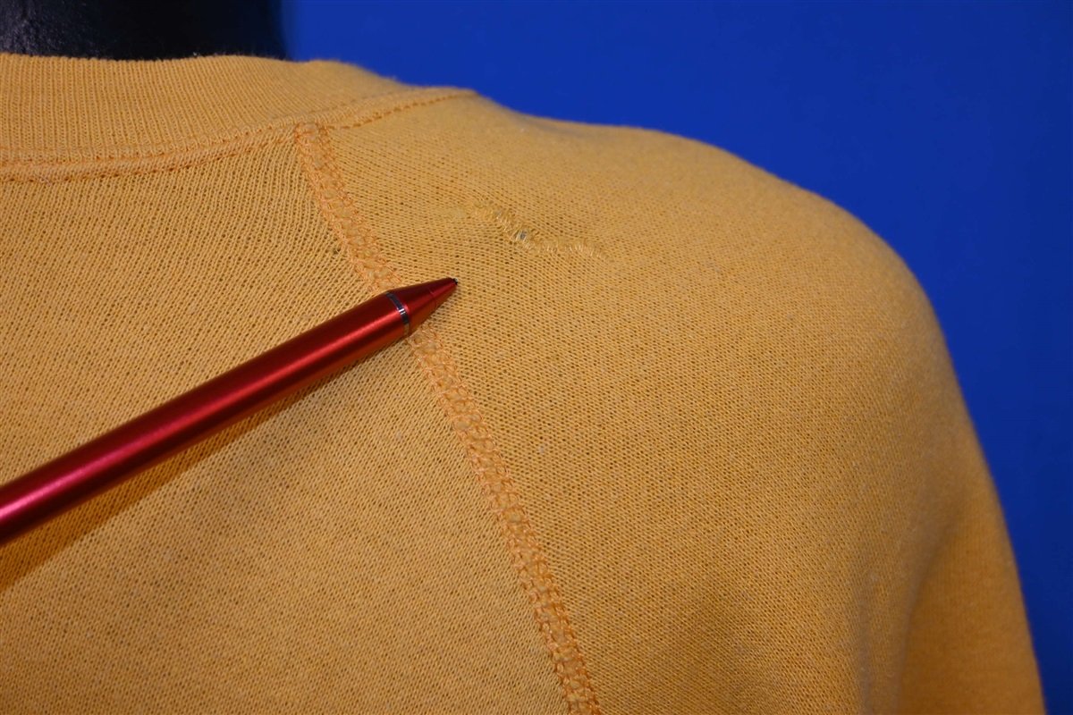 Fits like a modern unisex adult medium. Repair on the back shoulder, see pics.