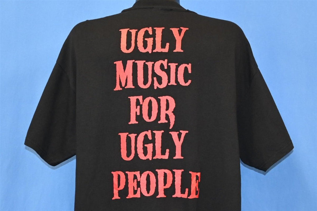 This awesome double-sided tee is for the delightfully spooky heavy metal band, White Zombie, and the back proudly reads, "ugly music for ugly people". White Zombie was formed in New York City in the 80s, and they later became an influential force in the burgeoning genre of industrial metal. The group was co-founded by their most well-known member, Rob Zombie, who christened the band after a 1932 horror film starring Bela Lugosi.