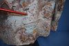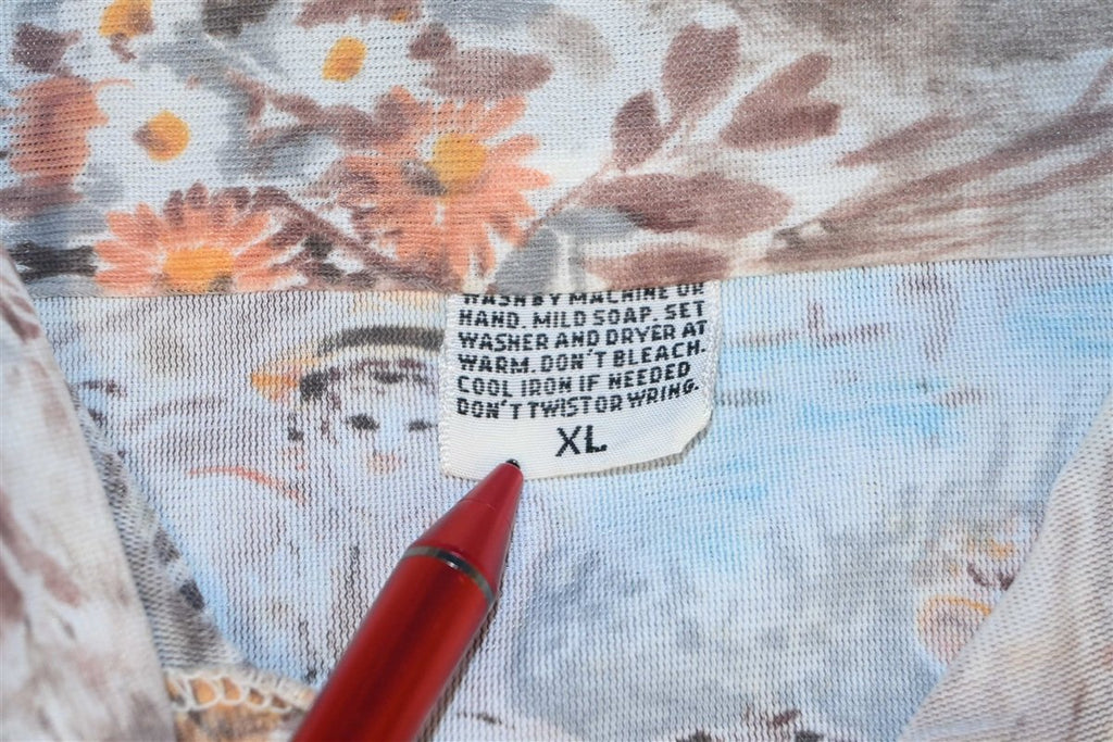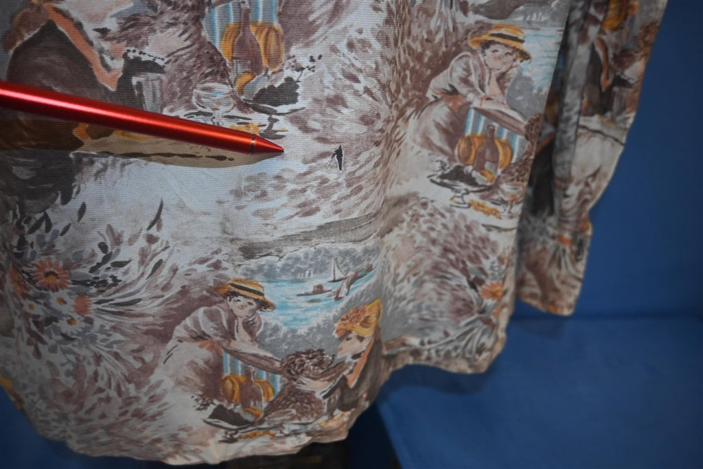 This beautiful vintage button down is perfect for art history fans. This 70s disco shirt is made from a silky synthetic material and decked out in a unique all over print. The pattern pays tribute to the French Impressionists of the 19th century, more specifically Pierre-Auguste Renoir. This shirt draws inspiration from Renoir's painting Le Dejeuner des canotiers or Luncheon of the Boating Party, and in particular the pattern highlights the portion of the painting depicting Aline Charigot and a small dog. Charigot was a frequent model for Renoir, and the two were later married. This shirt was made a little less than 100 years after Renoir created the original painting, and decades later it remains a stylish tribute to his distinct style of art.