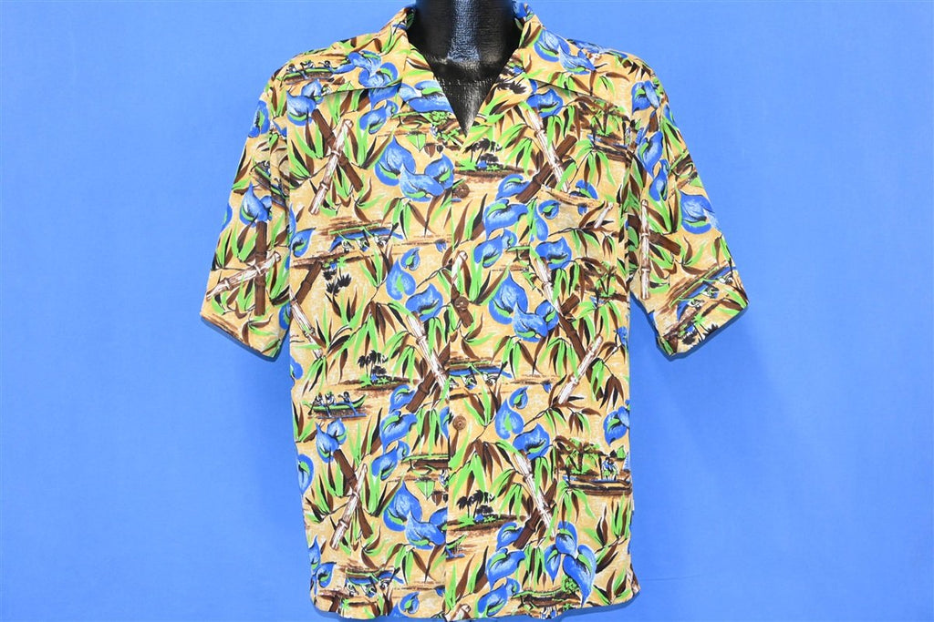 70s Hang Ten Gold Blue Floral Bamboo Hawaiian Shirt Large