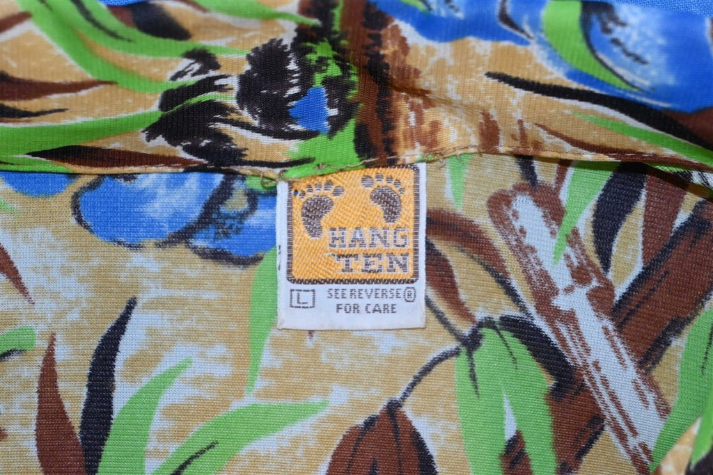 This stylish button down was made by the surfwear brand Hang Ten, and its tags feature the company's signature bare feet logo. This shirt was made during Hang Ten's early days in the 70s, and it features a 70s style big collar as well as a single chest pocket. This shirt is decorated with a bold floral print that includes blue anthurium flowers, bamboo, and figures sailing in outrigger canoes.