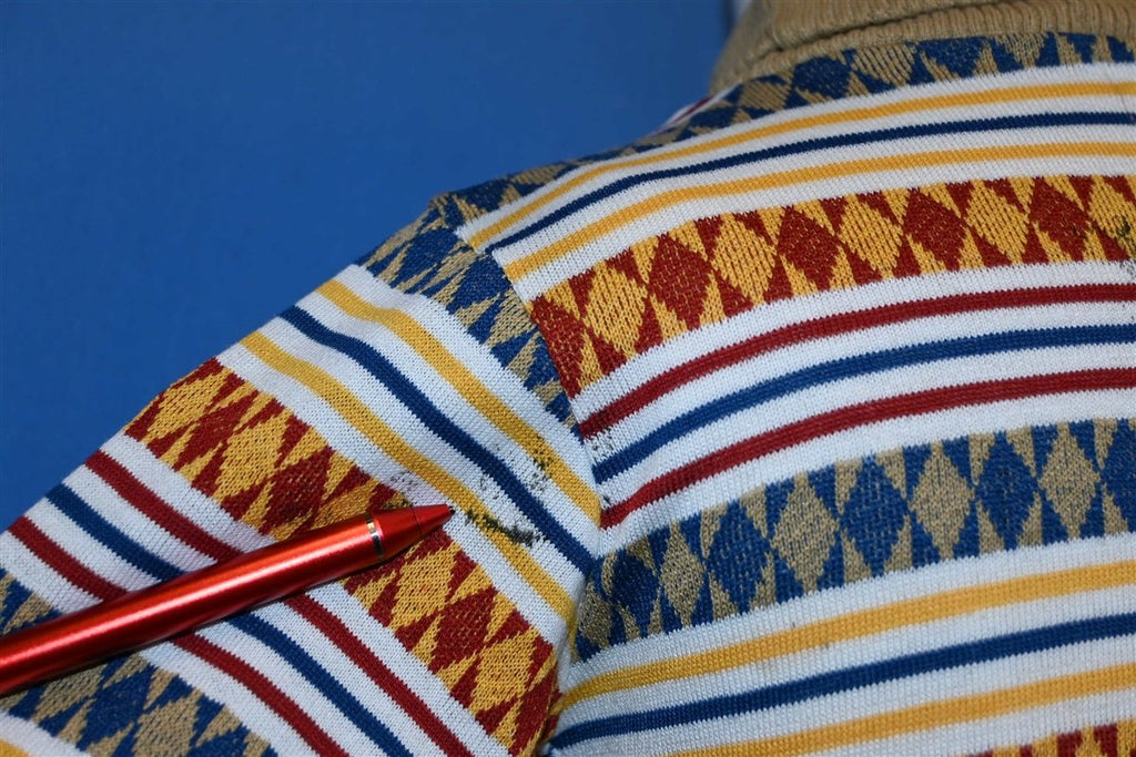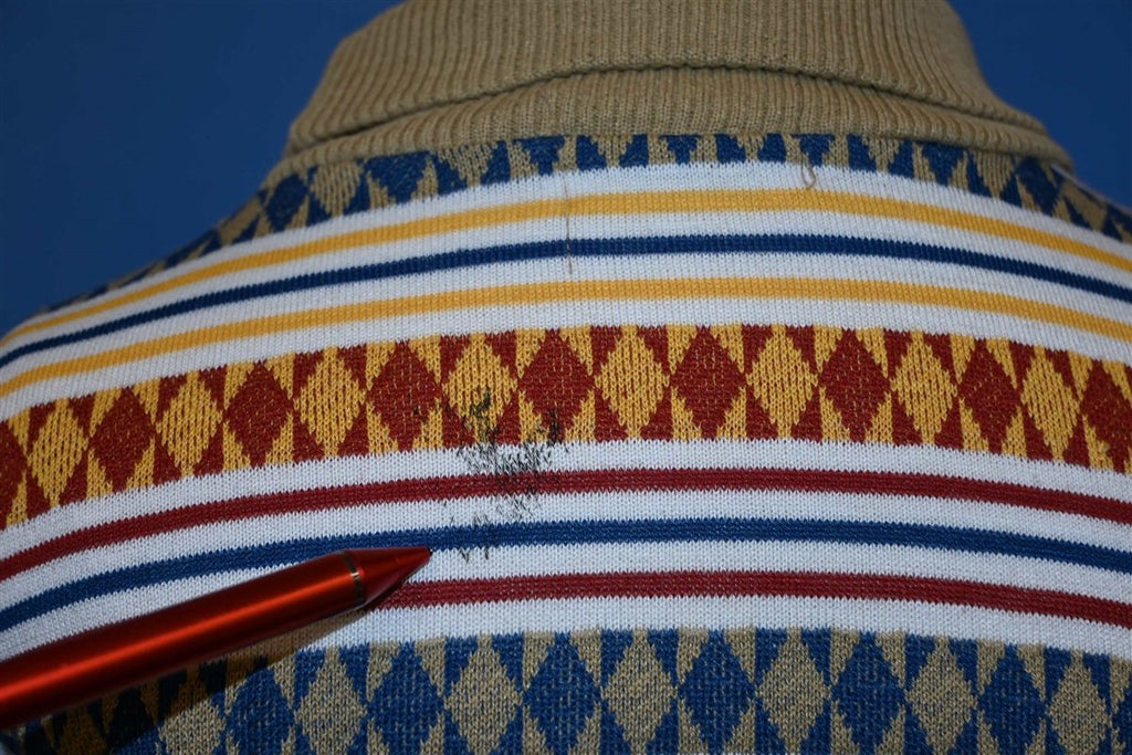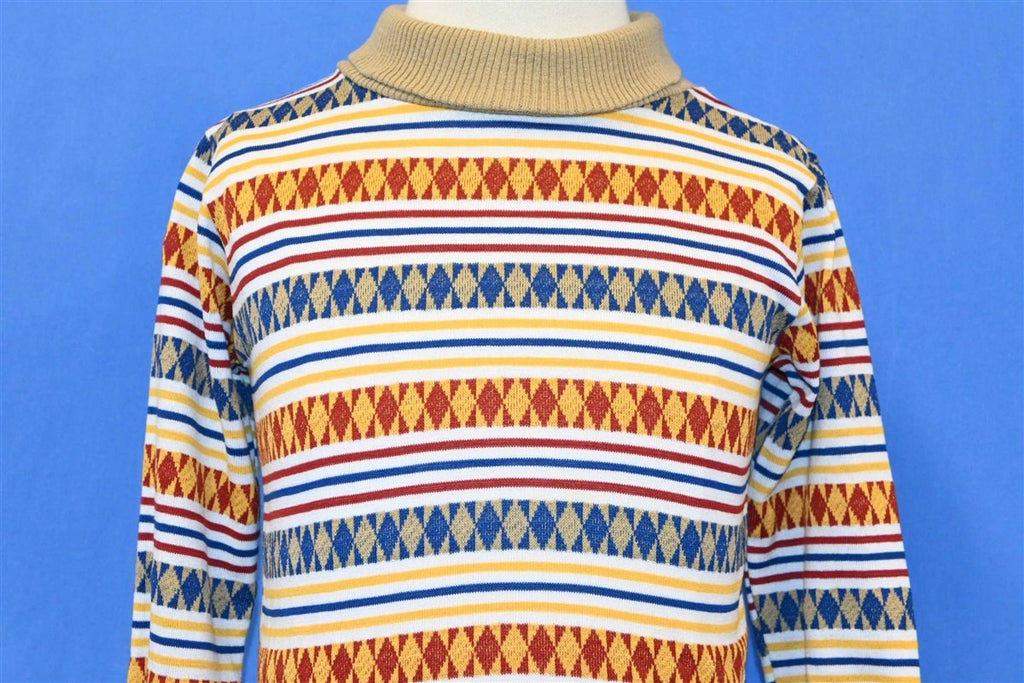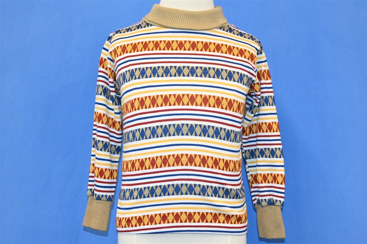 This vintage kid's shirt was made by Health-Tex during the 70s, an era in which the company was one of the leading children's apparel brands in the US. This long sleeved turtleneck features a delightful geometric design with colorful diamonds and horizontal stripes.