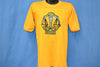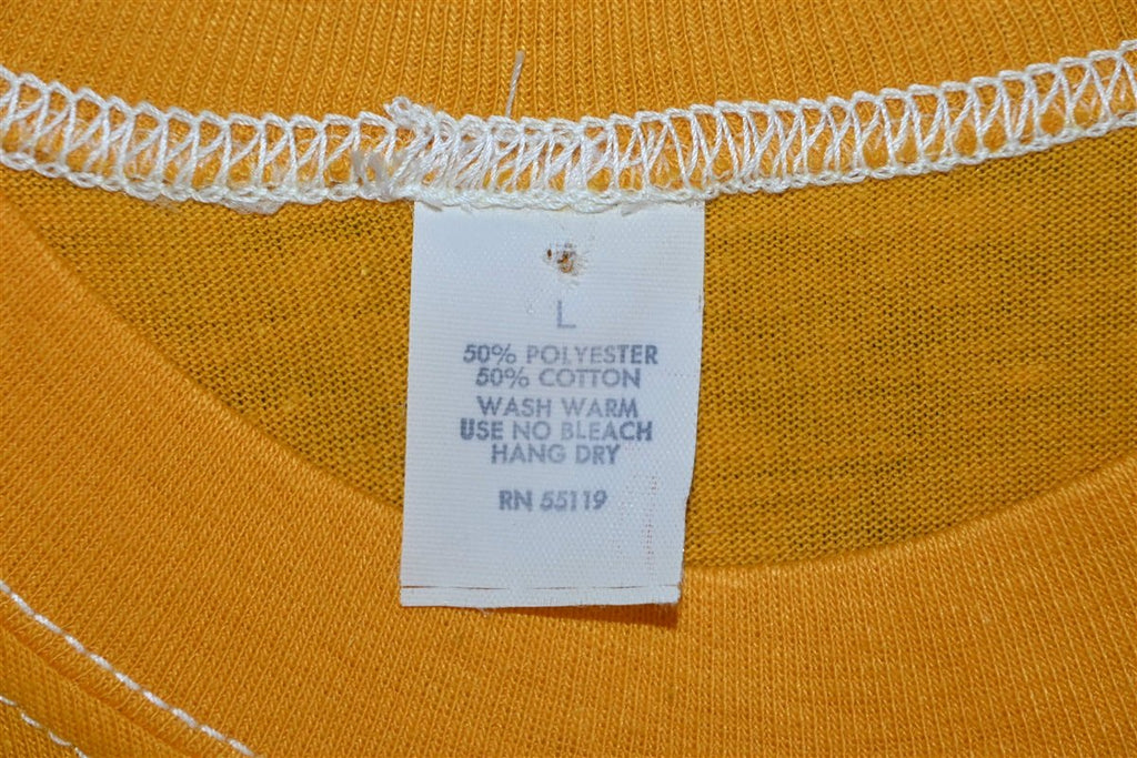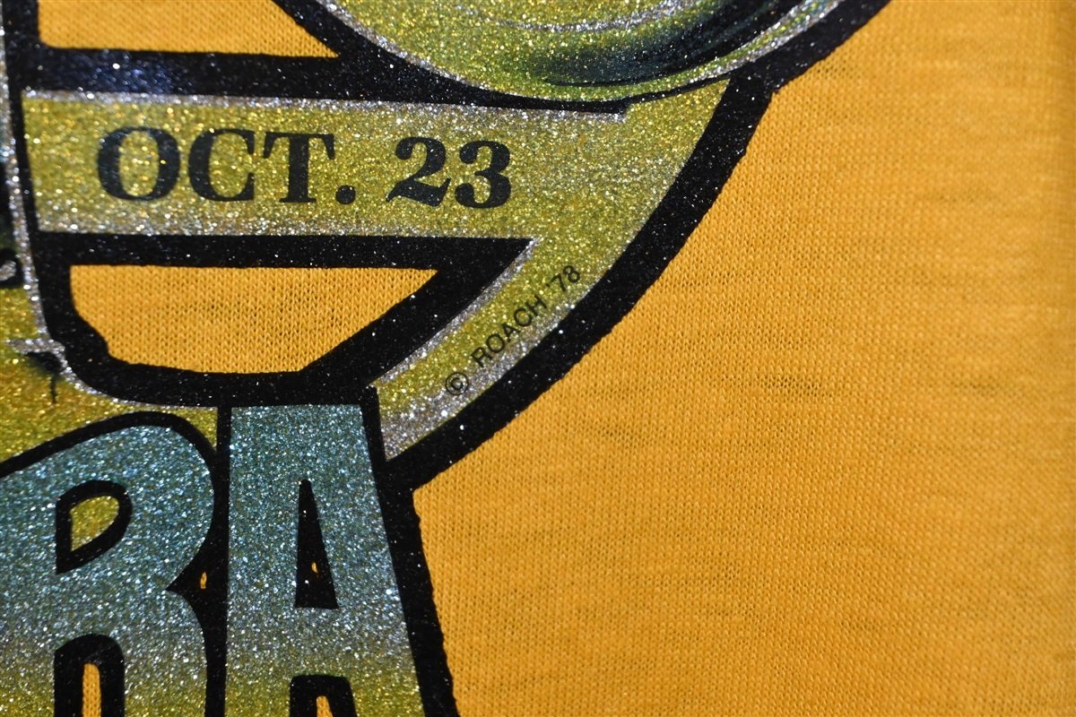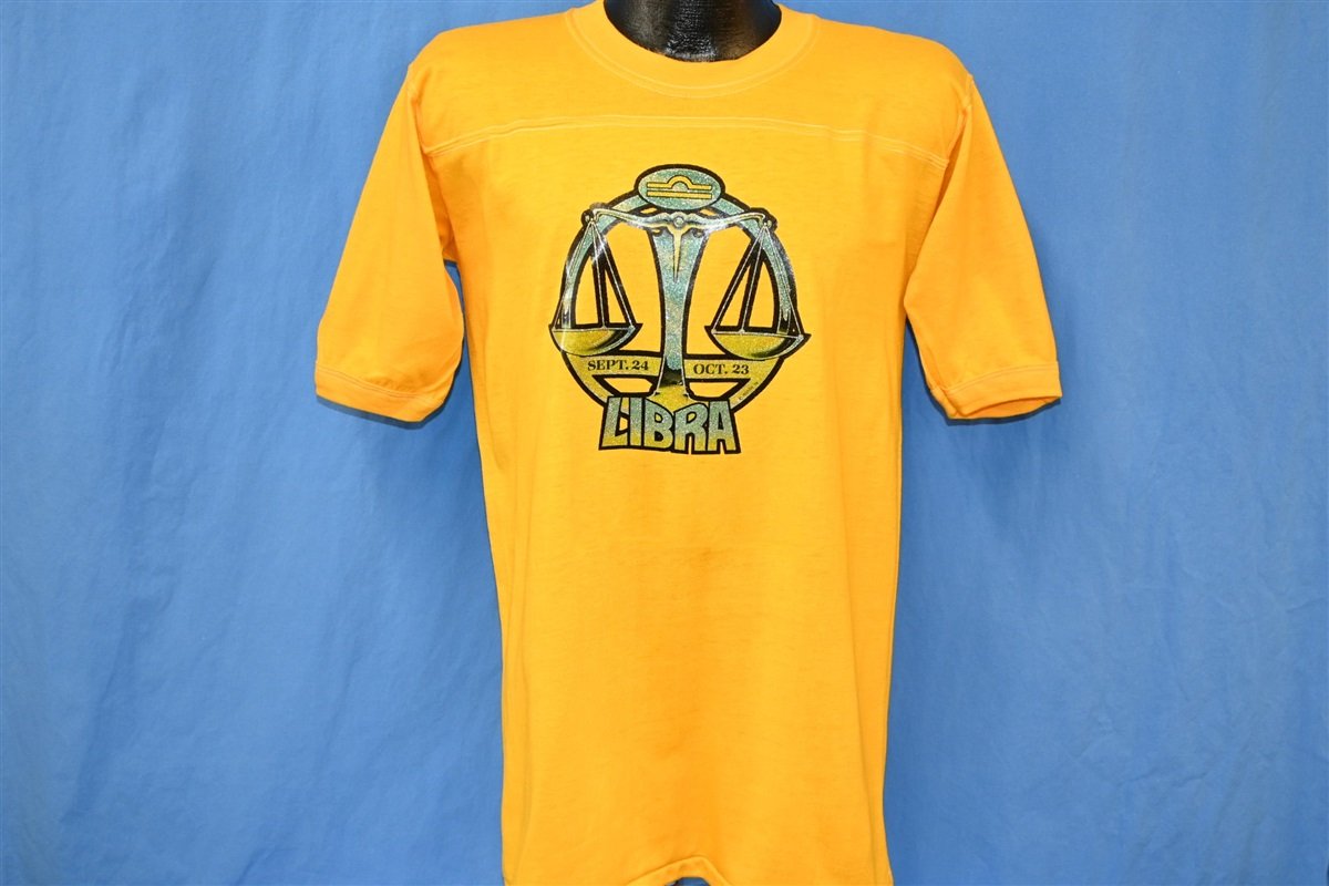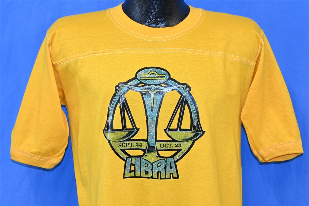 This bright yellow jersey style t-shirt was made back in the 70s and it's been customized used a glittery iron on graphic from the popular t-shirt company Roach. Roach was one of the leading producers of iron on graphic tees during the 1970s. Their artwork, which was inspired by the airbrush t-shirts and hot rod artwork of 1960s Kustom Kulture, were bold, colorful, and easy to apply to your favorite tee. This shirt pays tribute to the zodiac sign Libra, the scales. Libras are said to be friendly and charming, but also frank. The awesome graphic is the perfect keepsake from the horoscope fad of the 1970s.