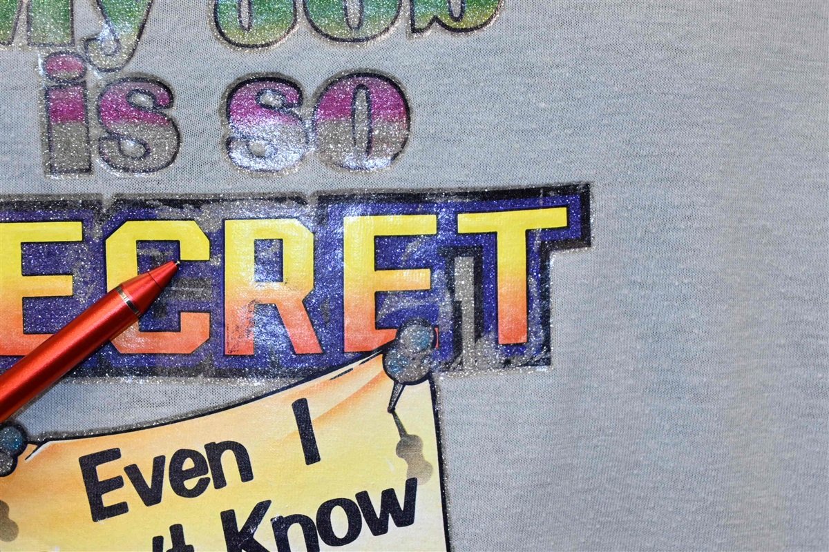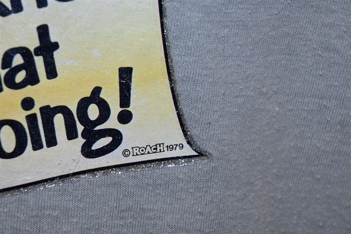 This funny vintage tee features a humorous iron on graphic from the 1970s, which reads, "My job is so secret even I don't know what I'm doing." This colorful iron on was made by the company Roach, who played a major part in helping to popularize iron on graphic tees back in the 70s and 80s. The company was started in the early 60s by brothers Russ and Dennis Roush. The two were inspired by the flashy cartoon imagery found in underground comix and the custom cars scene, and they created Roach shirts as a way to bring these eye-popping graphics into the mainstream.