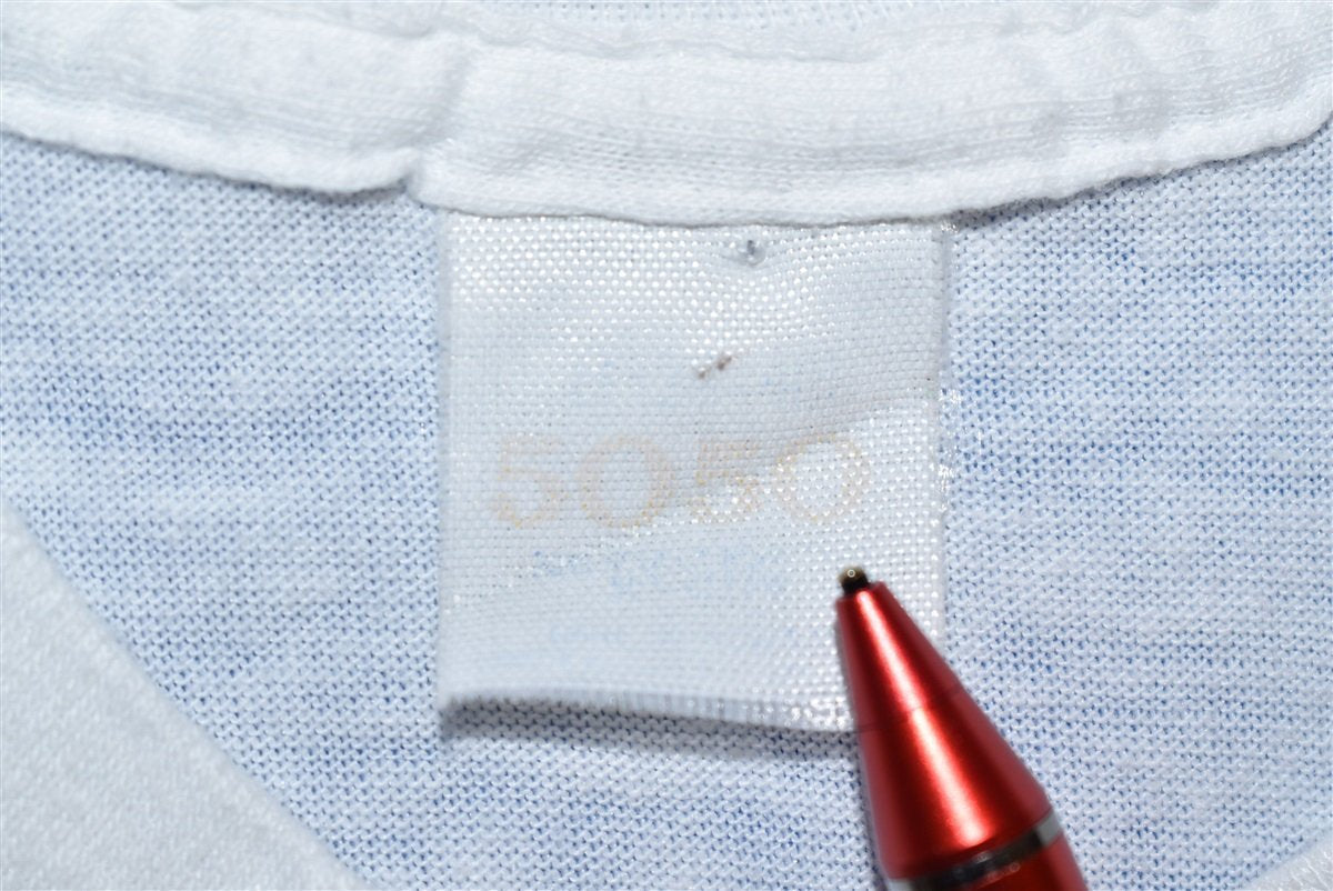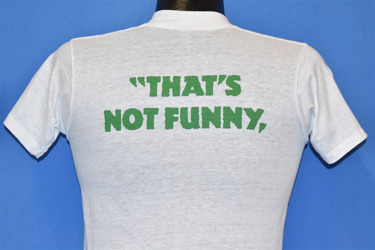 This white vintage shirt features the image of a cartoon frog and the words "That's Sick!" The shirt is for the National Lampoon's sketch comedy album That's Not Funny, That's Sick , which featured routines from comedians John Belushi, Brian Doyle-Murray, Bill Murray, and Christopher Guest among others. The album was first released on vinyl back in 1977 and it was a spin off from the National Lampoon magazine that took several of its sketches directly from the National Lampoon Radio Hour.
