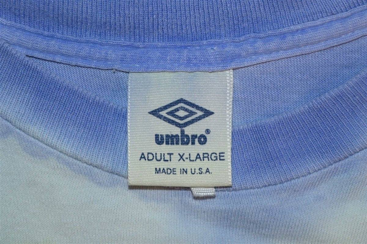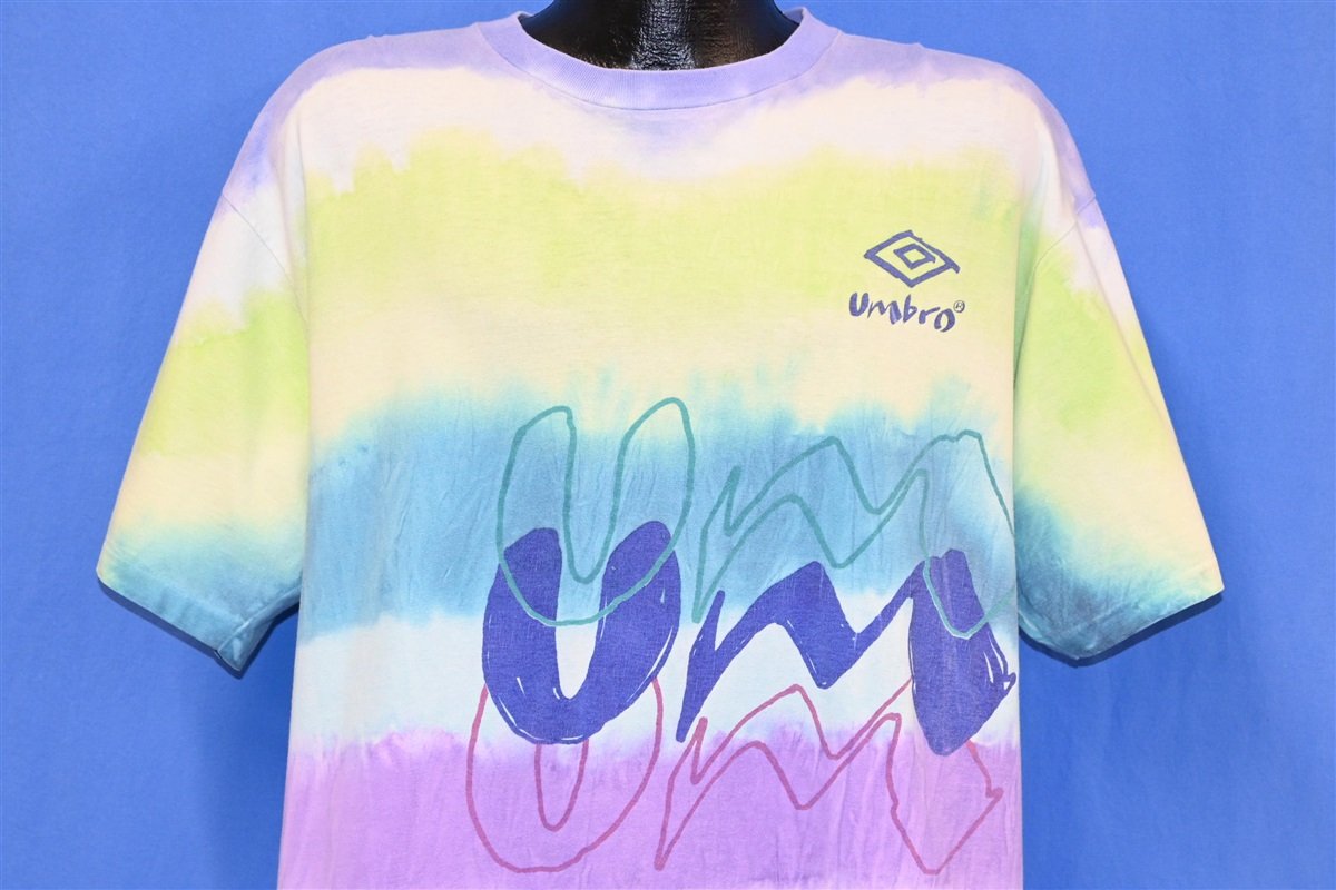 This colorful tie-dye tee was made by Umbro sometime in the 1990s. Umbro is an English brand known for their football and rugby sportswear. It was founded nearly 100 years ago by Harold and Wallace Humphrey. The name, Umbro, is a portmanteau of um, from Humphreys, and bro for brothers.