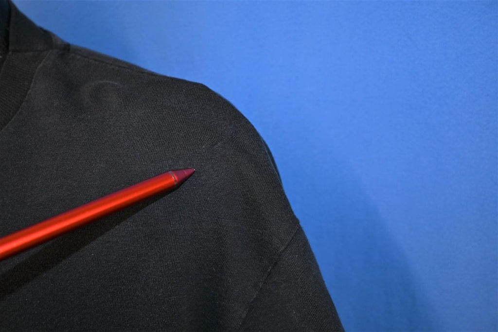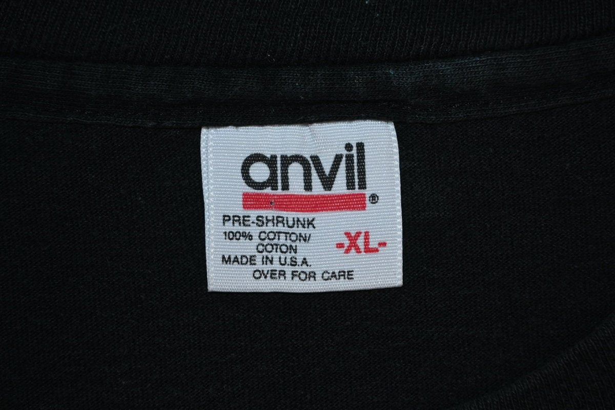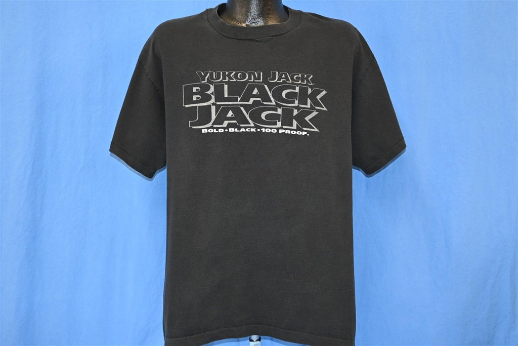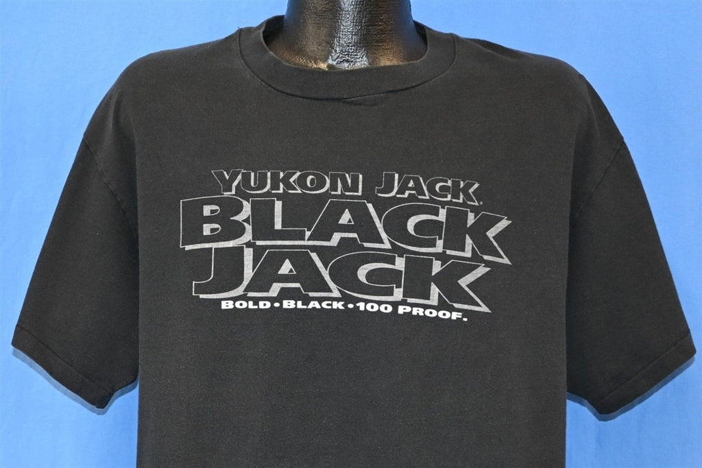 This vintage tee promotes Black Jack Liqueur, one of several flavored alcoholic beverages made by the Yukon Jack brand. Yukon Jack is a Canadian brand manufactured by the Sazerac Company, and their original flavor is made from Canadian Whisky and honey. Yukon Jack also makes cinnamon and apple flavored liqueurs, but this shirt is for one of their now defunct products Black Jack, which was black licorice flavored. The Yukon brand is commonly known as "the black sheep of Canadian Liquors" thanks to its unique qualities.