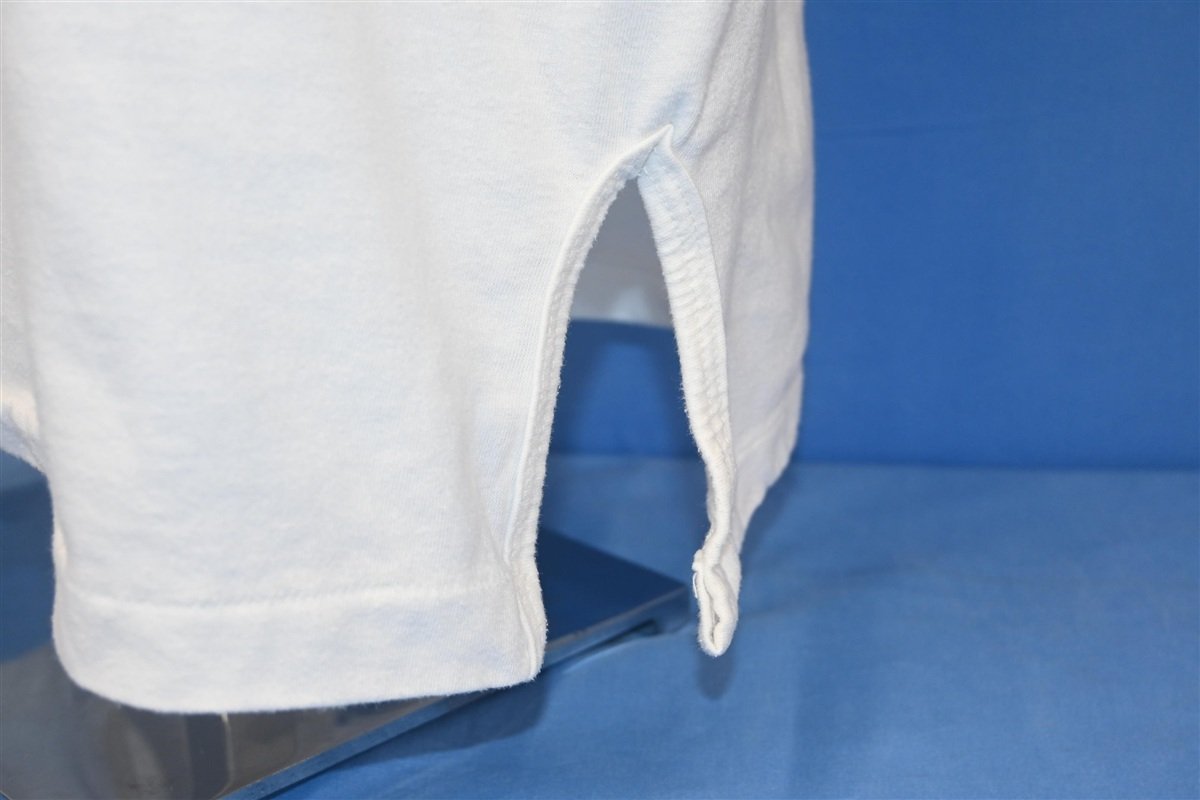 Fits like a modern unisex adult Extra Large. This shirt has tennis tails, see pics.