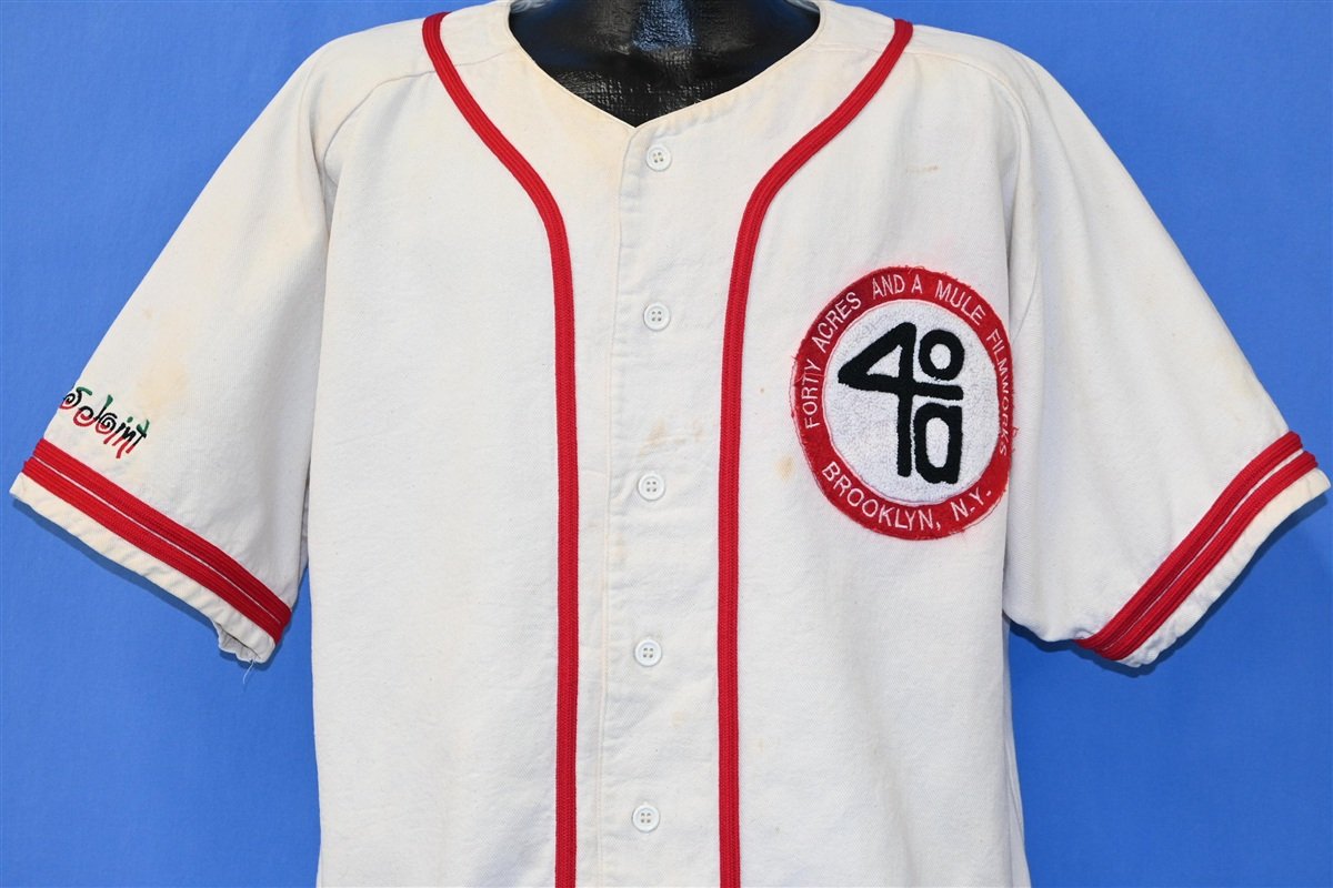 This awesome button front jersey is for 40 Acres and a Mule Filmworks, the production company that was founded by the acclaimed filmmakers Spike Lee and Monty Ross. The pair met at Morehouse College and also took mass media courses together at what came to be known as Clark Atlanta University. 40 Acres eventually became the company that Lee used to produce all of his theatrical films, starting with She's Gotta Have It in 1986.
