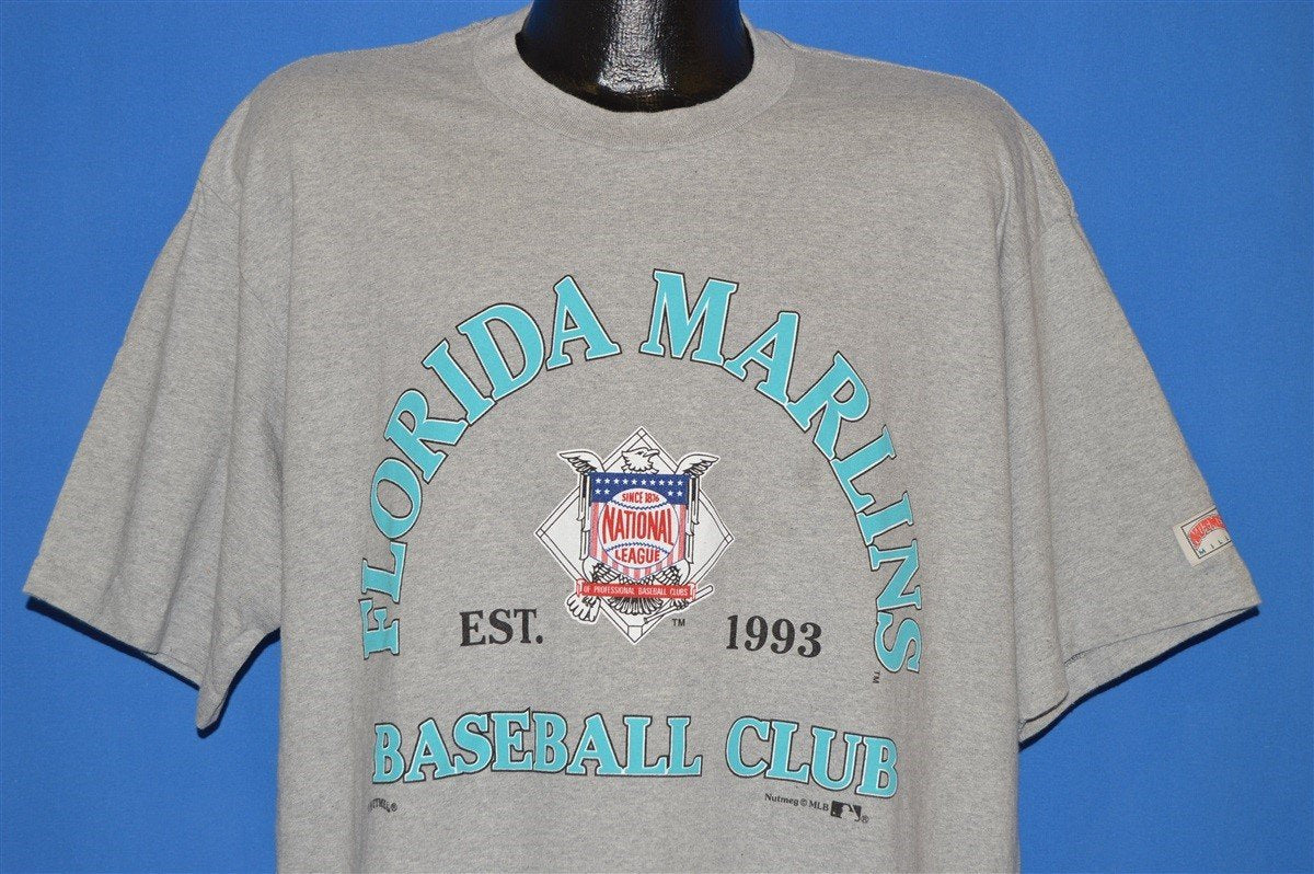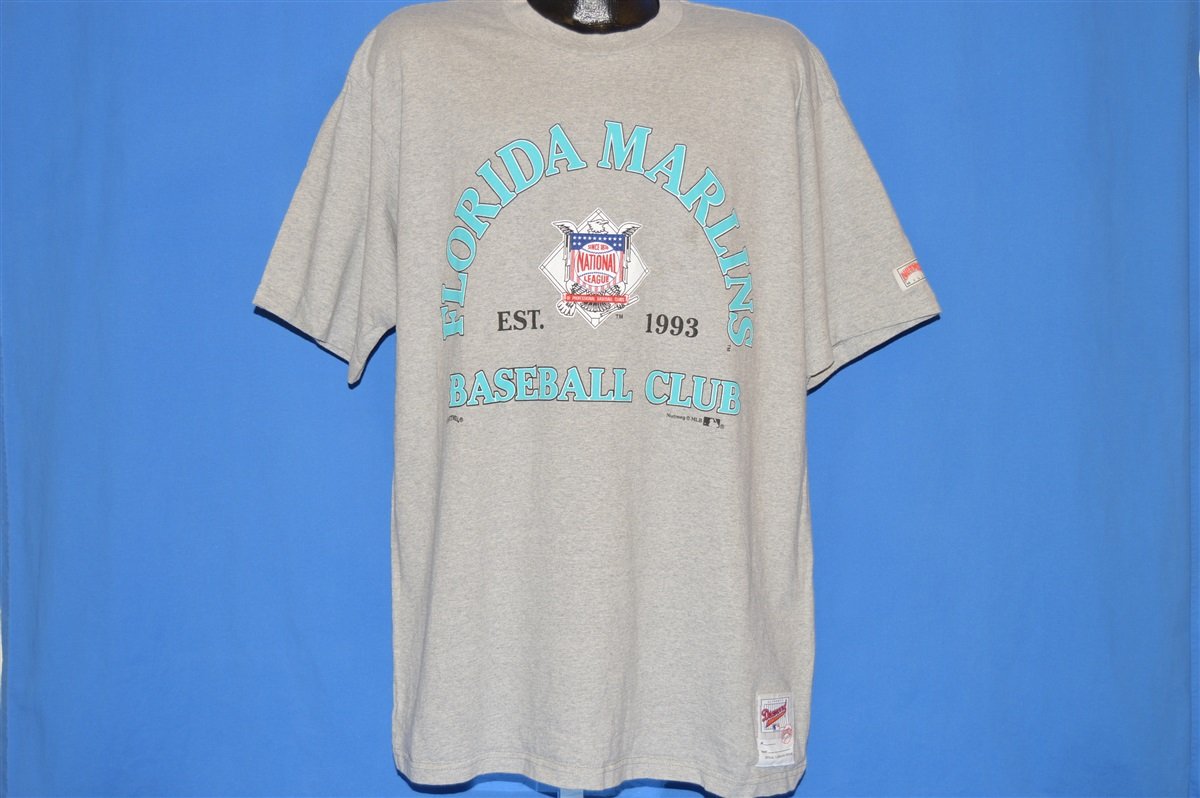 This gray shirt is for the MLB baseball team the Florida Marlins and it has the team's name and colors across the front. The Marlins started as an expansion team in 1993 and they played out of Joe Robbie Stadium, which they shared with the Miami Dolphins. They were then moved to Marlin Park in 2012 and their name was changed to the Miami Marlins. The Marlins have only qualified for the post season three times, but two out of the three times they managed to make it all the way to the World Series and they won the series in both 1997 and 2003.